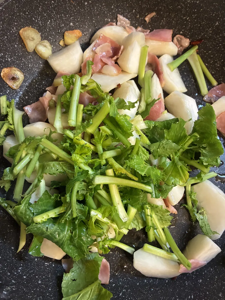④小かぶが透き通ってきたら葉も加え、塩とブラックペッパーで味を整えたら出来上がり❣️