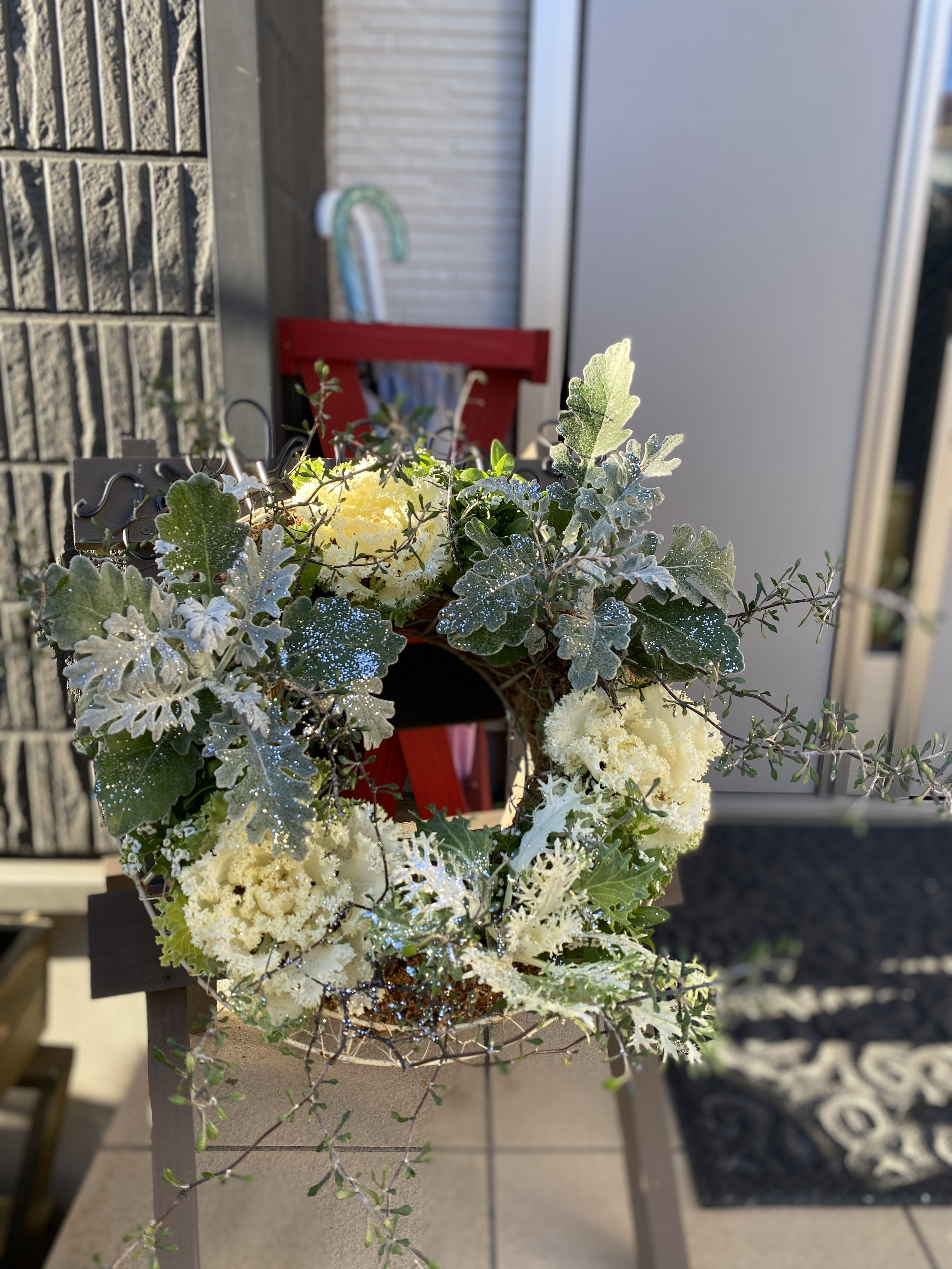 投稿を表示マッキーさん、おはようございます🌞。無事に完成良かったですね✨ラメ入りの葉牡丹で華やかなウエルカムリースですね💞(◕ᴗ◕✿)