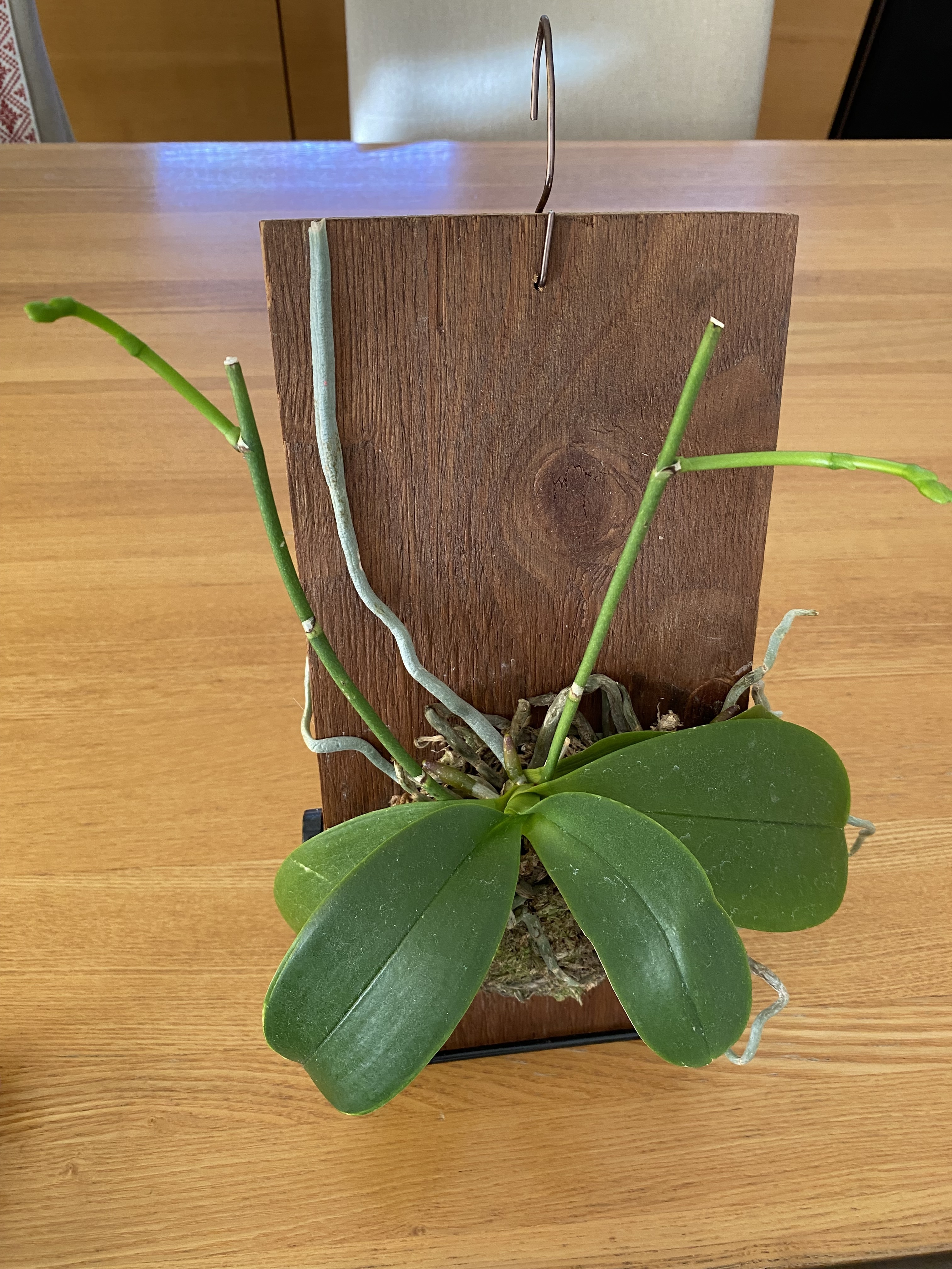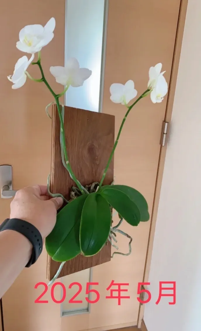 胡蝶蘭の板付け、こんな感じでゆる〜く育ててます。壁にかけたりタブレットホルダーで立てかけたりして飾れます😀
