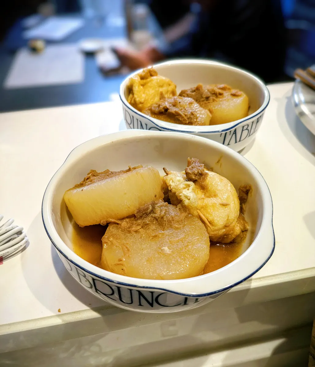 ①面取した大根6切れは、米の研ぎ汁で下茹でする(圧力鍋30分)粗熱が取れたら軽く水洗い ②巾着玉子4個(油揚げを袋状にし全卵を入れ楊枝でとじる) ③シーチキン汁ごと一缶 ④だし汁(水200cc顆粒だし小さじ1)、砂糖大さじ1、しょう油大さじ1、みりん大さじ1、 めんつゆ大さじ1/2〜1程度 鍋に調味料を入れ大根と巾着玉子を並べ、シーチキンを汁ごと入れ、蓋をして15分ほど煮る。大根を静かに返し味が全体にしみるようにアルミホイルで落とし蓋をして5分弱火で煮含ませる。
