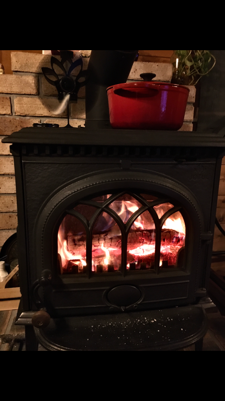 薪ストーブの赤々とした炎🔥でポカポカ良いですね。お鍋もコトコト良いなぁ💕💕💕癒やされます。🙇