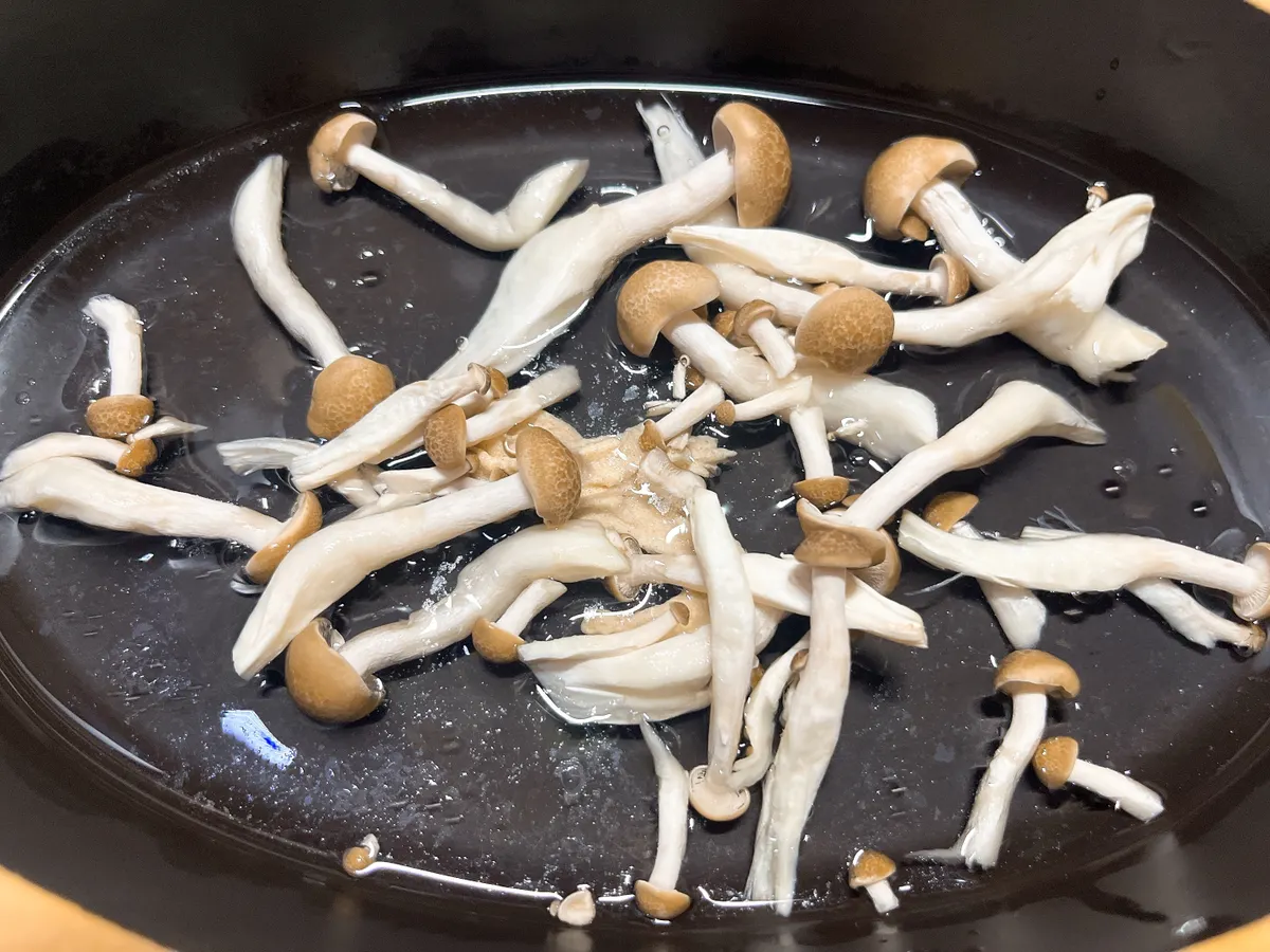 パスタポットに、水・しめじ・香味ペーストを入れて、レンジで500W1分30秒、加熱します。