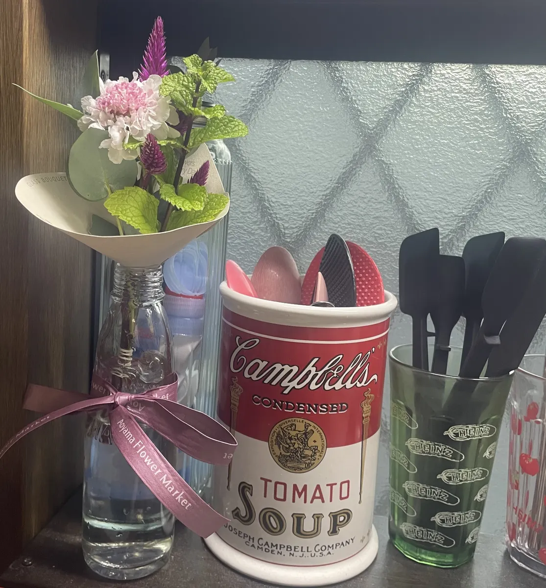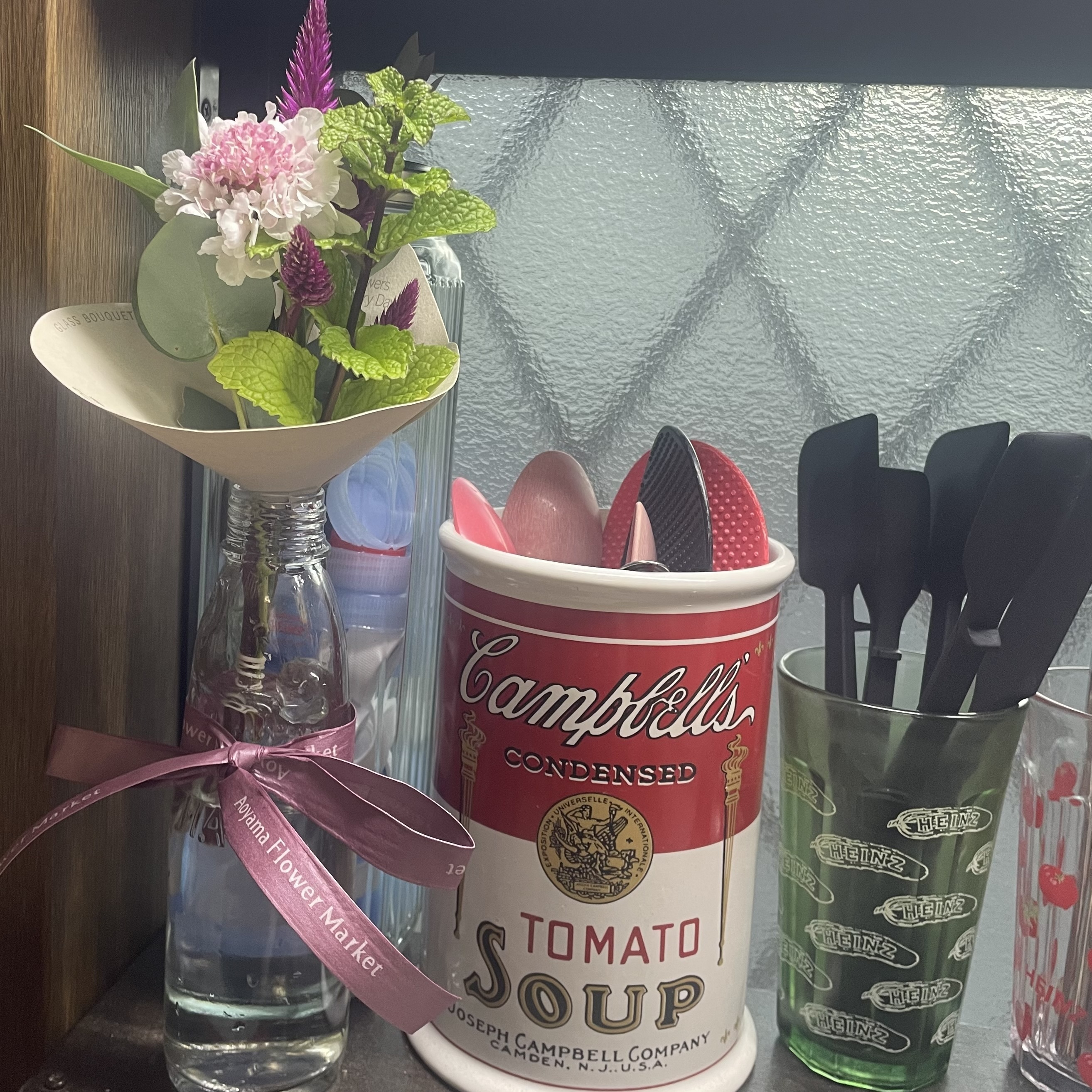 投稿を表示キッチンにミニブーケ💐ラムネ瓶もオサレに🎀つけて可愛くなった🥰娘ちゃんからの🎁送った側も可愛いキッチンの彩りで幸せな気分になってるよ😆🫶