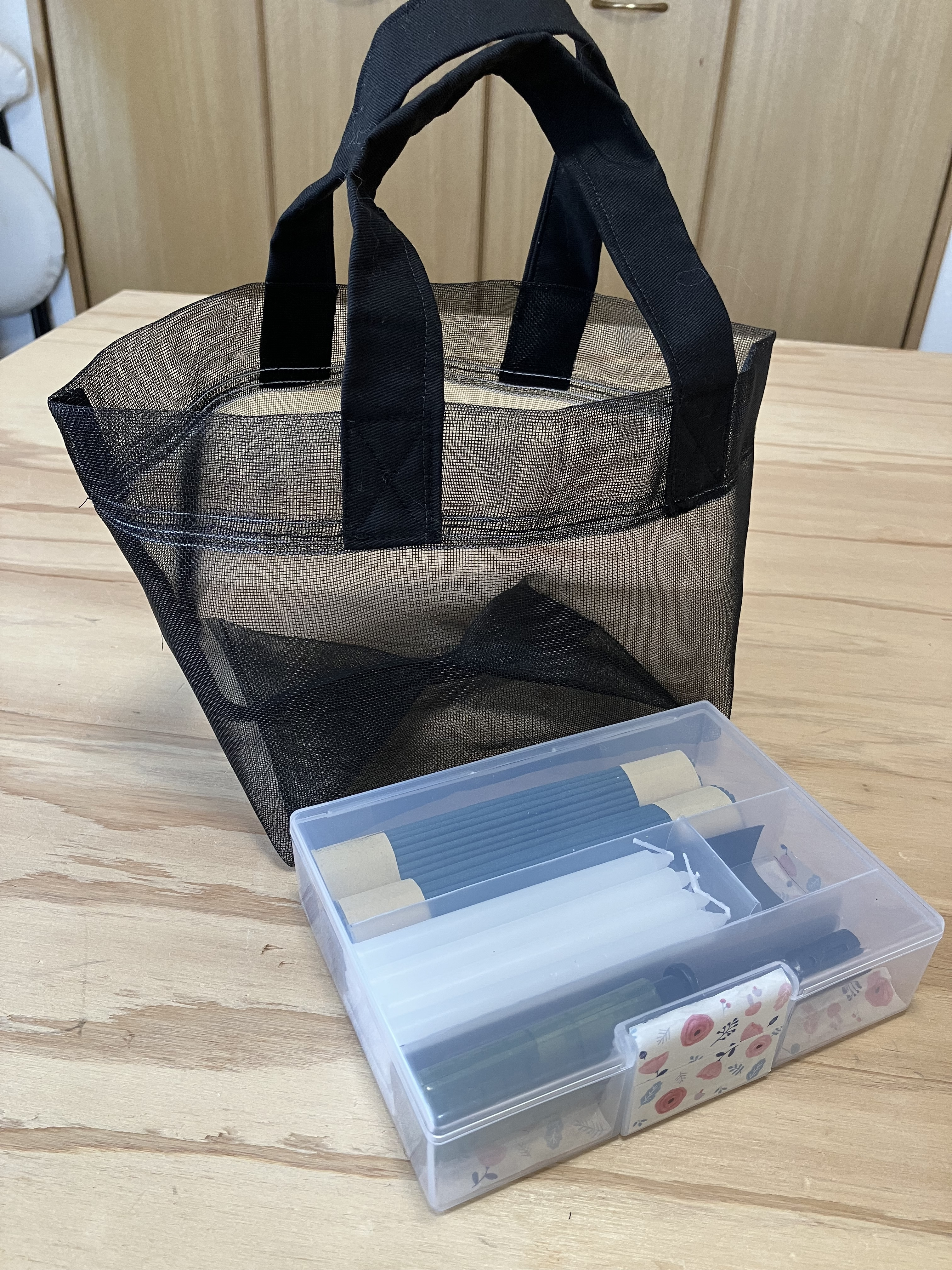 外から見ても何が入ってるかすぐわかるお墓参りセットできました。