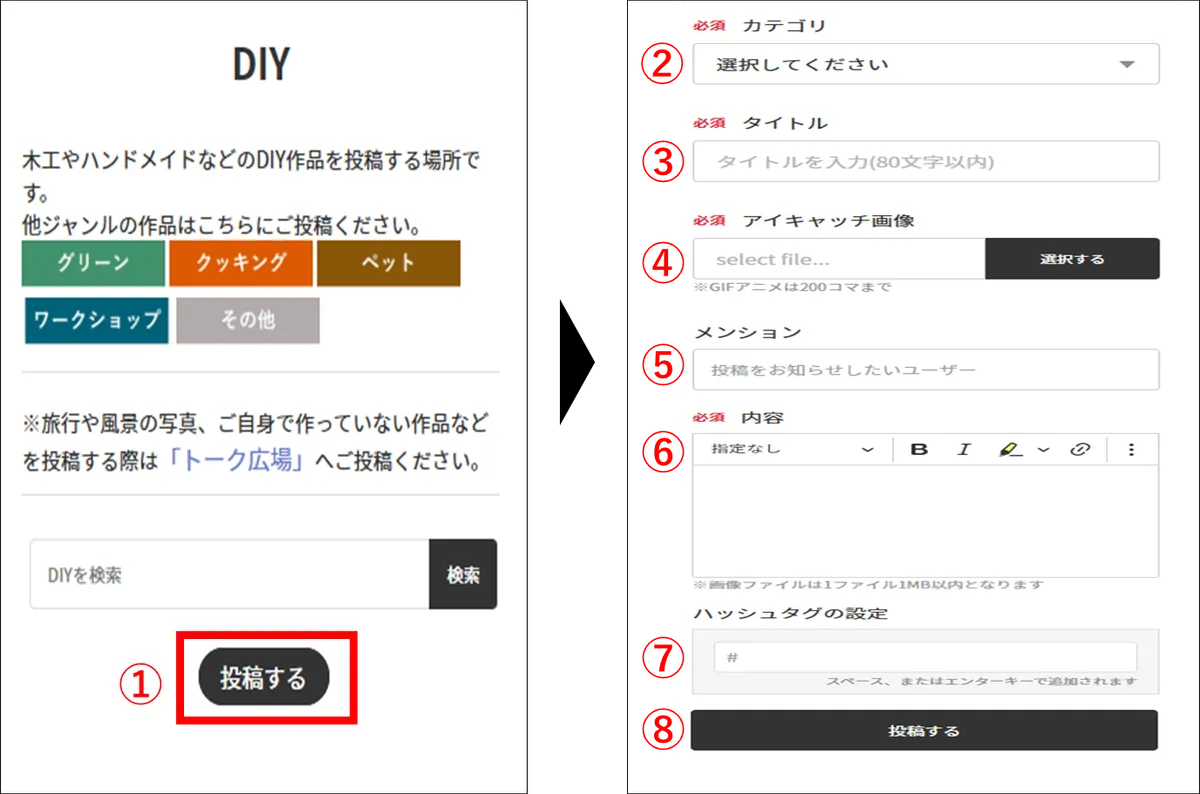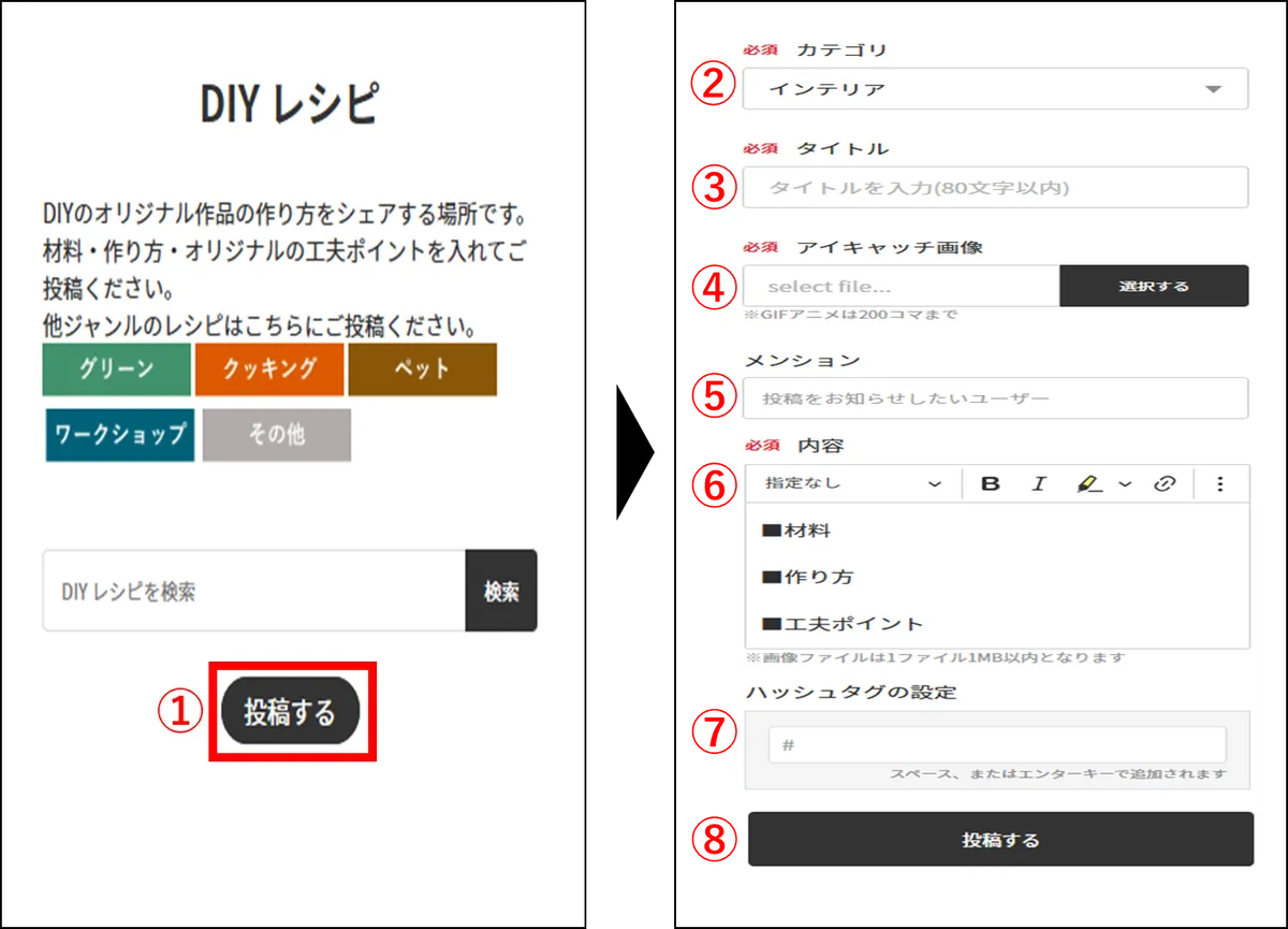 6. 「内容」に材料、作り方、工夫ポイントを入力(カテゴリを選択すると自動でフォーマットが表示されます。)