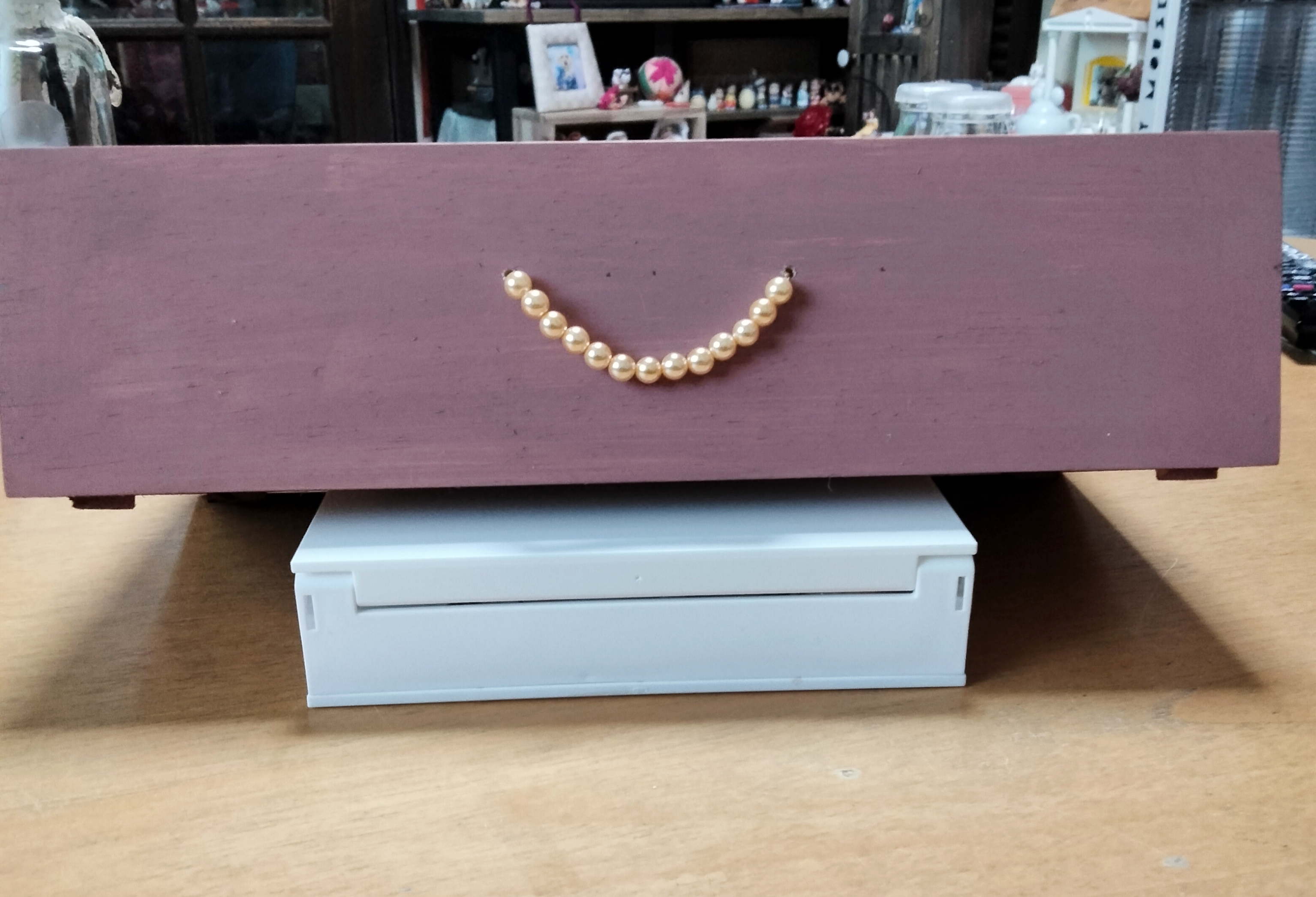 投稿を表示サイズピッタリで渋めのピンクの引き出しとパールと把手がお洒落で可愛いですね😉💕🎵