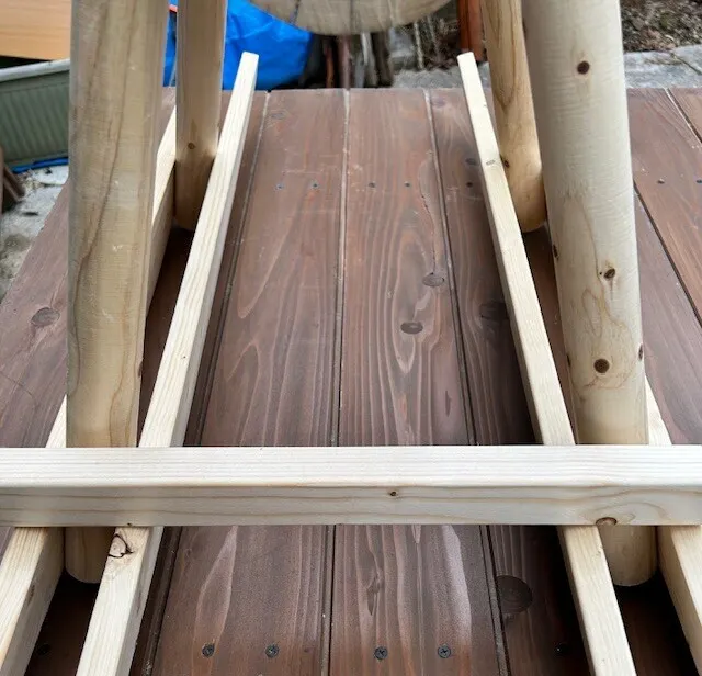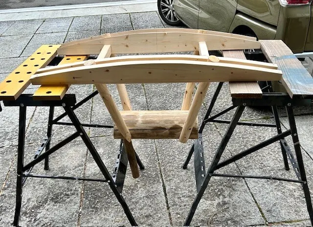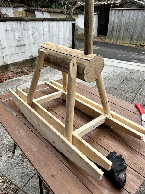 今日は開き具合を安定させるために左右の足の間に垂木を斜めに切った物を付けます。
