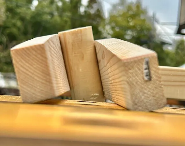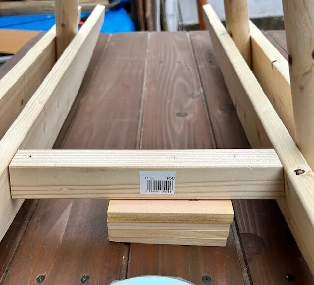 工房の端材コーナーで¥50で買った垂木のおかげで脚がぐらつくことがなくなりました〜🤗。
