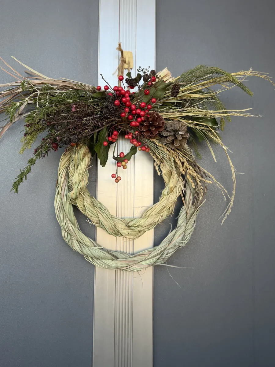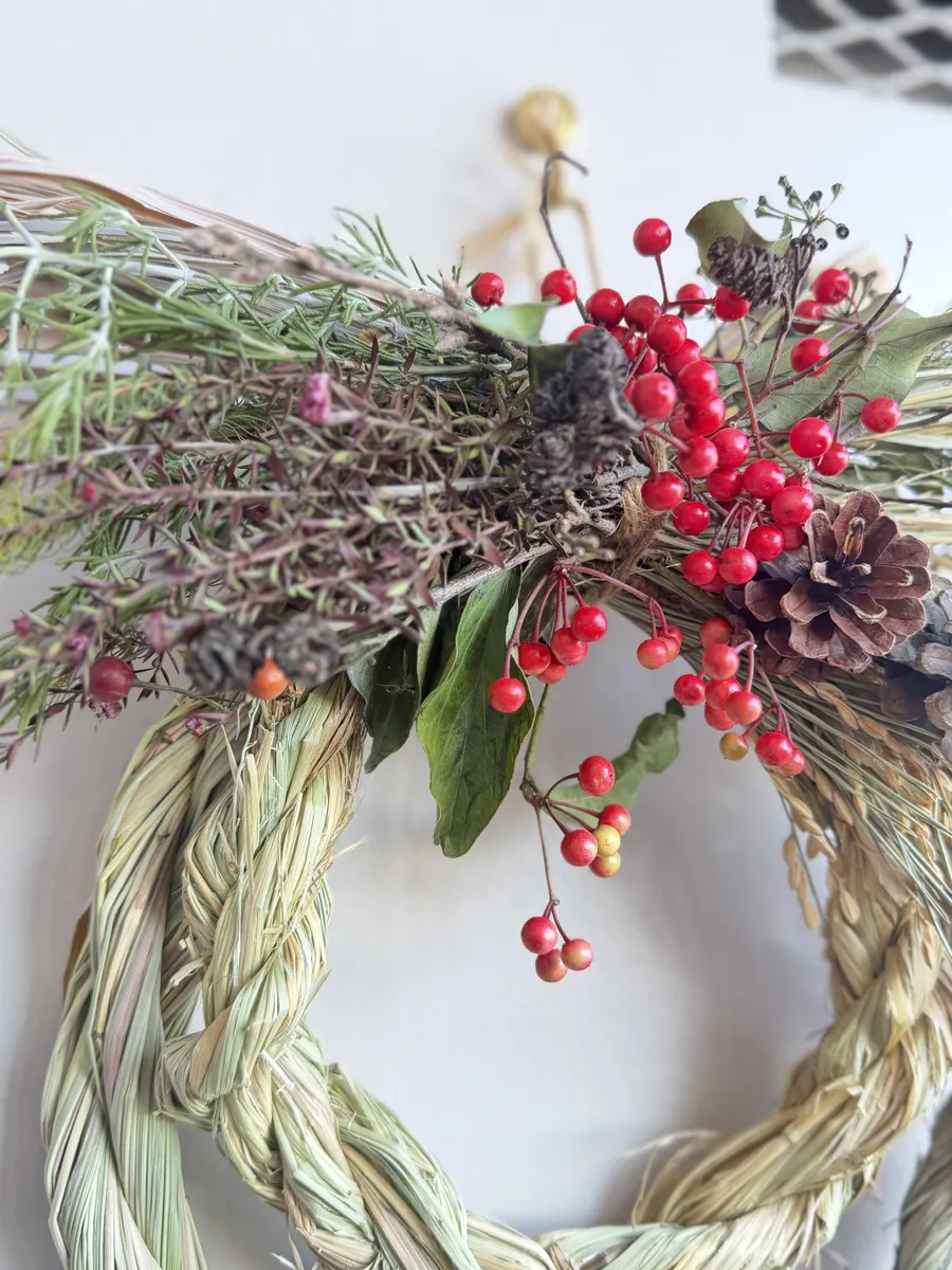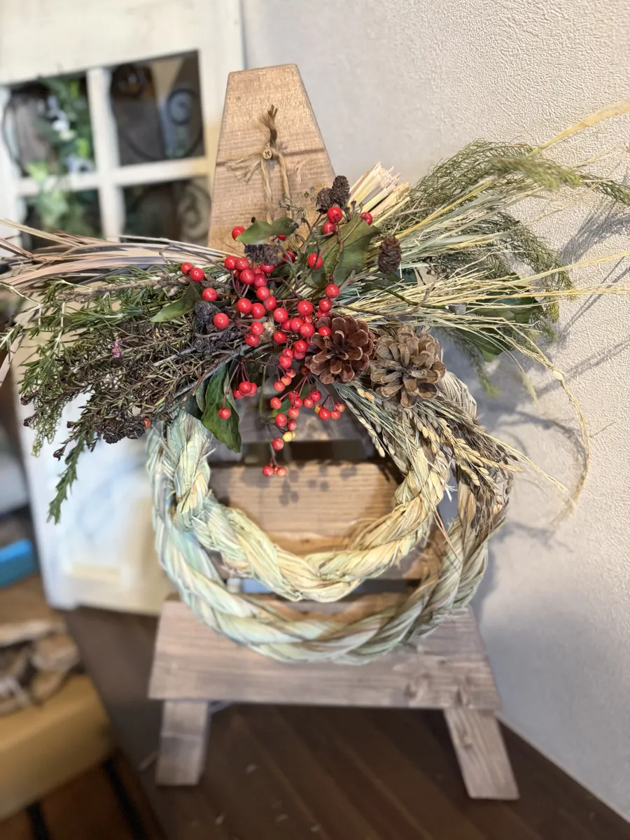 飾りは里山の松ぼっくりや自然観察会で取ってきたものやハーブに庭の千両を足して、天然素材だけにしました。