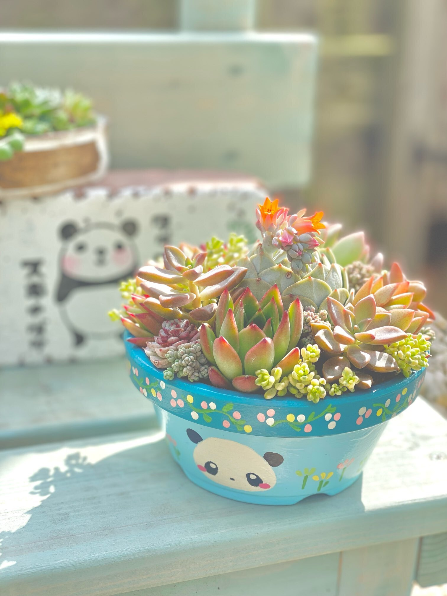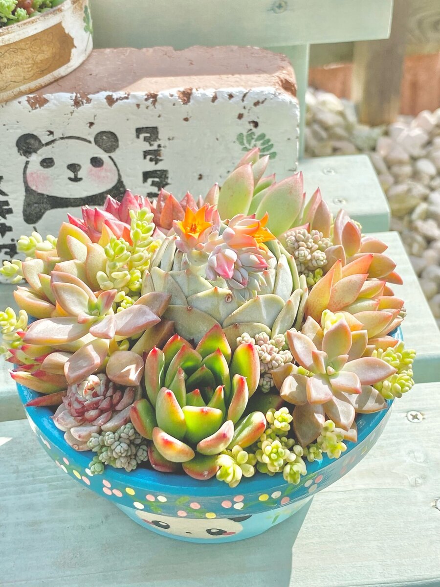 投稿を表示可愛い♥寄植えも可愛いし❗🐼の鉢も可愛いですね❗❗色も鮮やかで多肉が映えますね😍、楽しそうな寄植えの会いいですね〜❗❗楽しそう⤴️