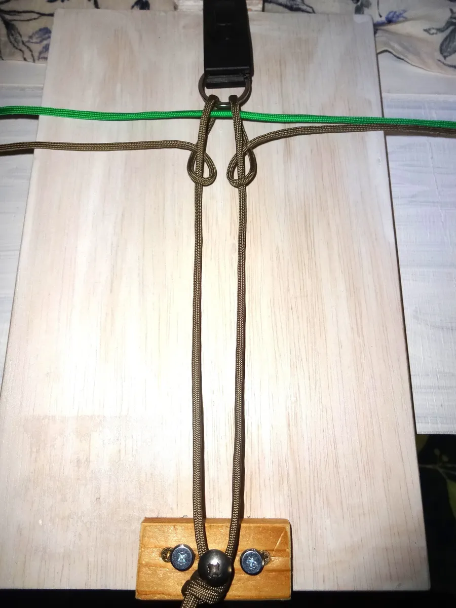 緑→2m程 茶→2.5m 中央を図の様に固定(重り)しないと編めません。