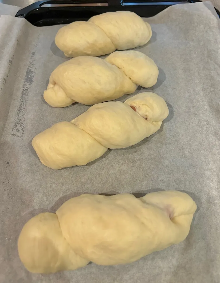 ウインナーロールは30cmほどの棒状に伸ばした生地をウインナーに巻き付けるだけ。