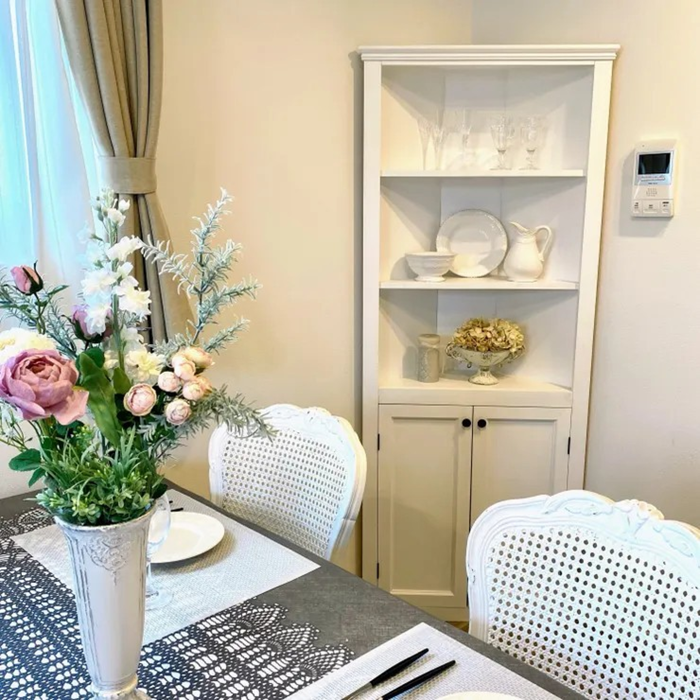 | No.9コーナーを飾るホワイトキャビネット | 角部分にピッタリ!白で統一されていて素敵です💐 |
