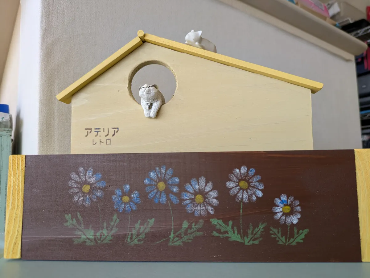 トップ > ワークショップ > キャンペーン > 小さいけれど〜🙀 DIY野良猫 2026/01/29 05:04 小さいけれど〜🙀 ワークショップに参加。 作品は小さいのに、意外と工程があって、 スタッフさんの説明について行かれず、 カッチンカッチンに固まってしまいました🙀 「⚫️⚫️⚫️さんが固まってる〜」と 固まった私にスタッフさをんが気が付いて、優しく何度も説明してくださいました😺 色選び、ノコギリ、色塗り、ステンシル、 組み立て! 完成〜👏👏👏 なんでも完成すると、また作りたくなります (スタッフさん泣かせですが〜😹) ワークショップ参加レポート いいね 共有する 共有する X LINE リンクをコピー コメントする 4 件の返信 (新着順) ミュートしたユーザーの投稿です。 投稿を表示 はっちゃん 2026/01/31 15:52 素敵 いいね 返信する ミュートしたユーザーの投稿です。 投稿を表示 くままん 2026/01/29 23:06 大人可愛い素敵な色ですね💕屋根と窓でまったりしてる猫ちゃんも可愛い😆 いいね 返信する ミュートしたユーザーの投稿です。 投稿を表示 DIY野良猫 2026/01/30 03:41 くままん くままんさま コメントありがとうございます😽 またつくりたくなります😺 いいね 返信する ミュートしたユーザーの投稿です。 投稿を表示 ぱふ 2026/01/29 19:59 工程が満載ですよね^ ^ 色もたくさんあって、イメージして行っても迷ってしまいます😅 抑えた色味のステンシルがシックで素敵ですね💓 いいね 返信する ミュートしたユーザーの投稿です。 投稿を表示 DIY野良猫 2026/01/30 03:40 ぱふ ぱふさま コメントありがとうございます😽 なかなかイメージ通りに いかないですね😹 いいね 返信する ミュートしたユーザーの投稿です。 投稿を表示 べるん 2026/01/29 15:59 綺麗な色合いと、猫ちゃんも ちょこんと飾れて、可愛いですね😻 スタッフさんのお心遣いも嬉しいですね。私も助けられていて、有り難く思っています❣️ いいね 返信する ミュートしたユーザーの投稿です。 投稿を表示 DIY野良猫 2026/01/30 03:39 べるん べるんさま コメントありがとうございます😽 スタッフさんに感謝です😽 いいね 返信する