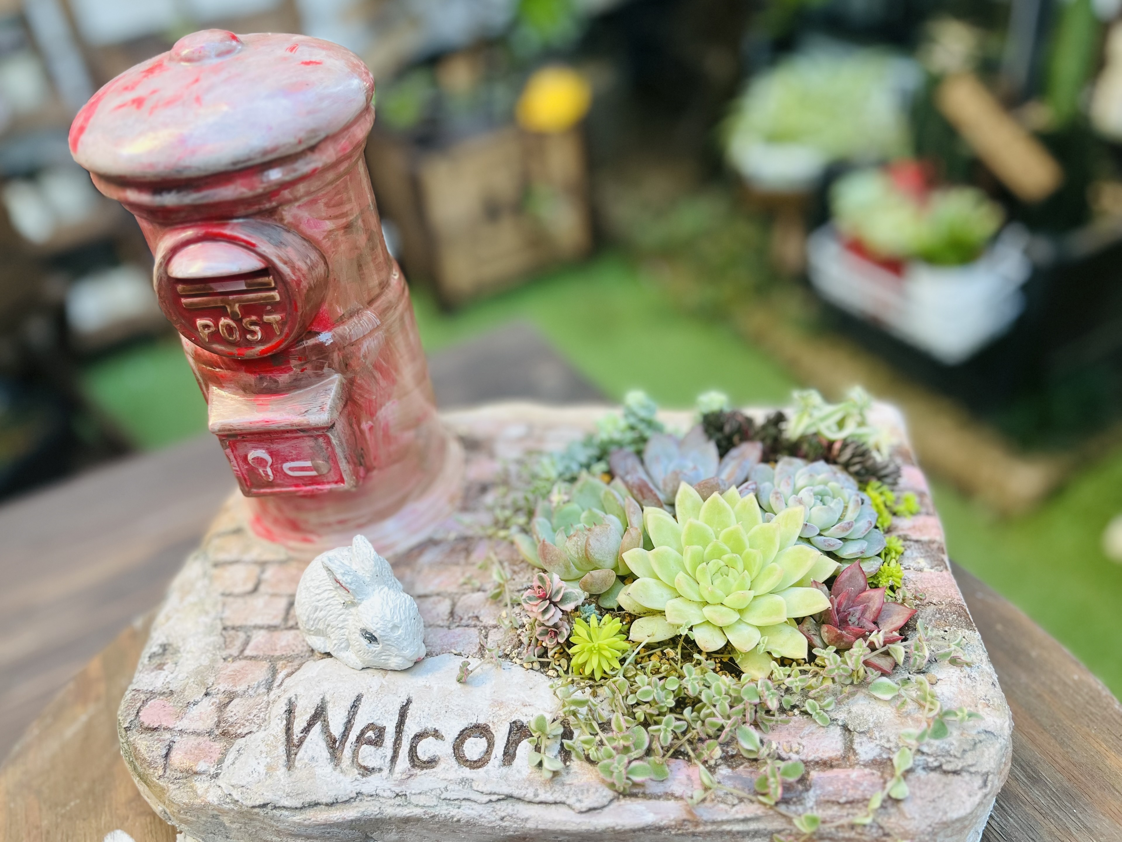 投稿を表示細かいセダムの寄せ植えがとても可愛いわ✨モルタルの風合いが多肉植物を引き立たせてくれるのね。色褪せた赤ポストも良い雰囲気で、素敵な作品です😊💕