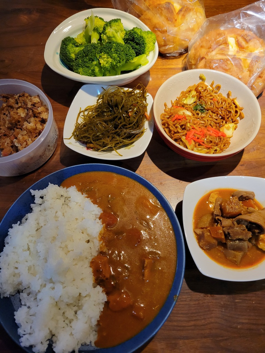 モツ煮、焼きそば、ブロッコリー、切りこんぶ、パン、もう一つが解らないですが、食べたいな🎶