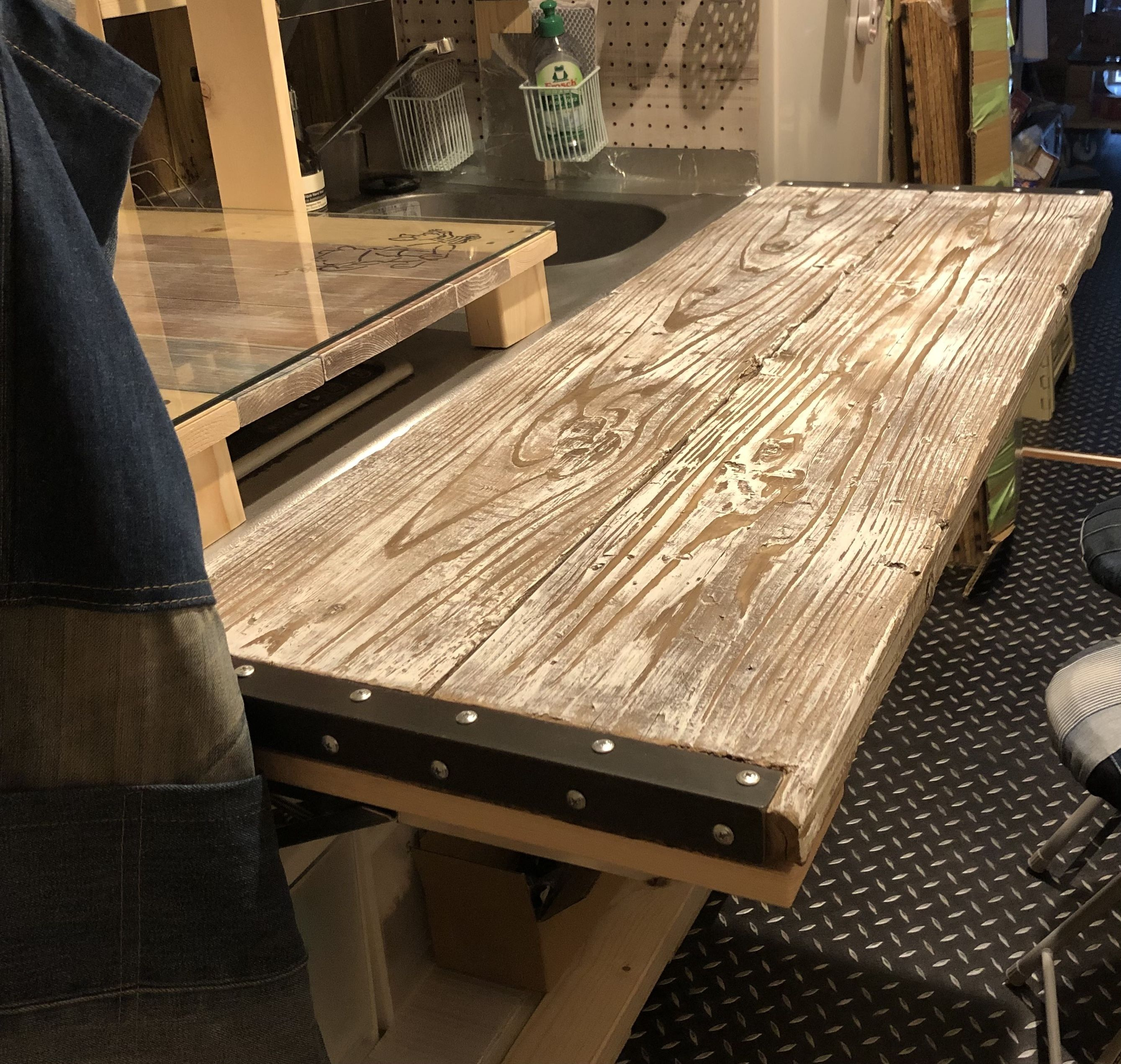 ノミで加工してアイアン金具(L字でしょうか?)をつけて細工がとても細かいですね。