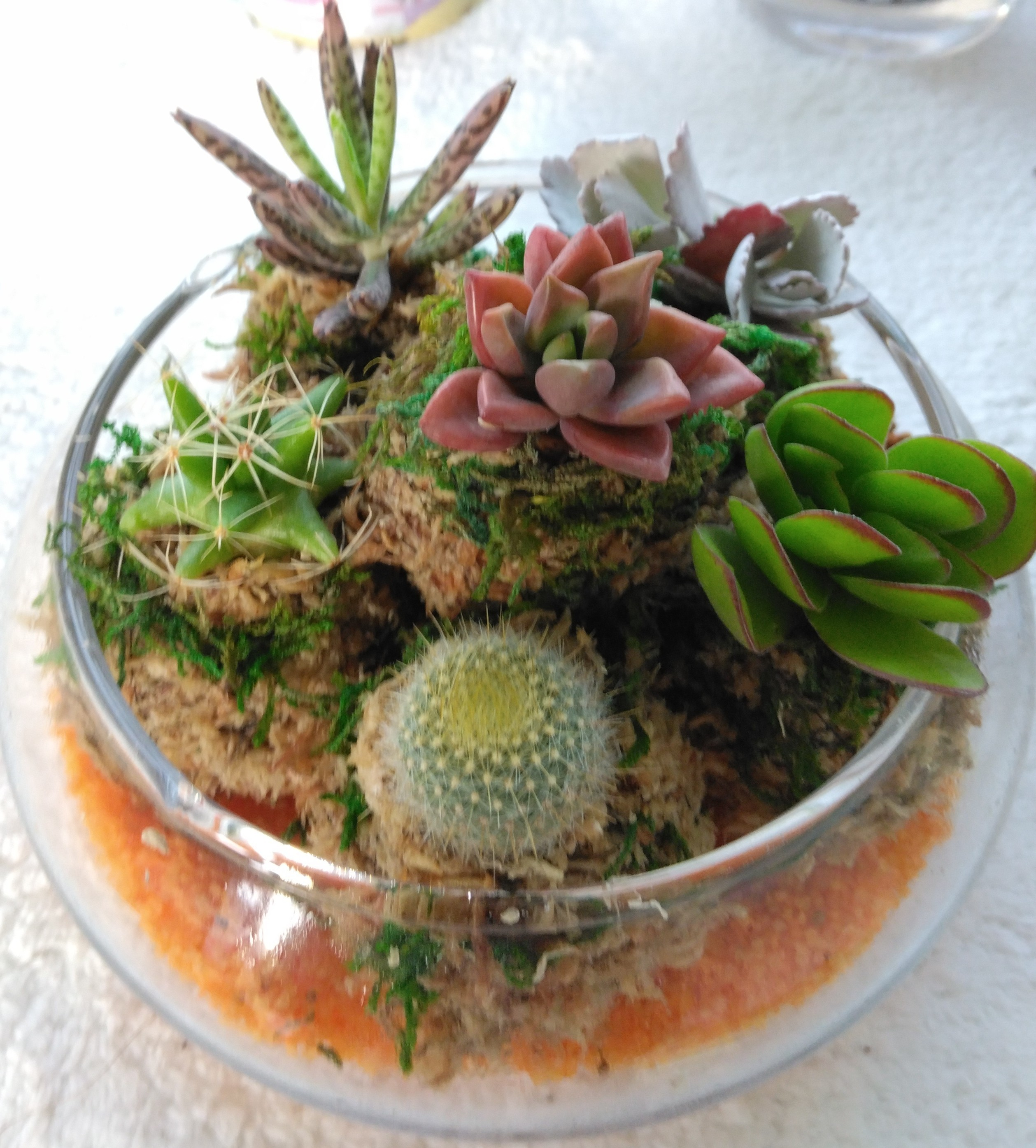 ガラスの器にサンド入れて、苔玉置いて出来上がり。
