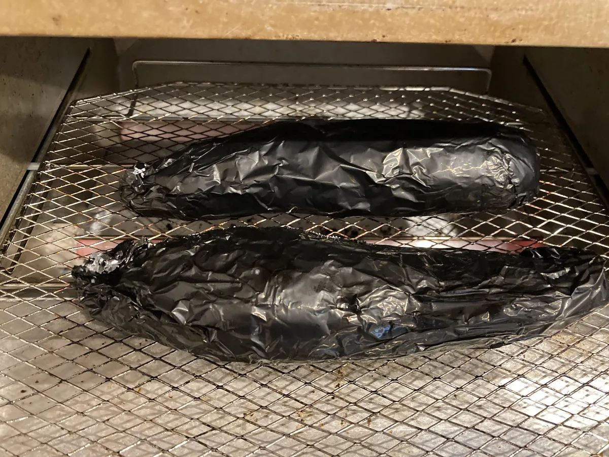 黒いアルミホイルに包んでトースターで220℃ 20〜30分焼きます。時々向きを変えて。