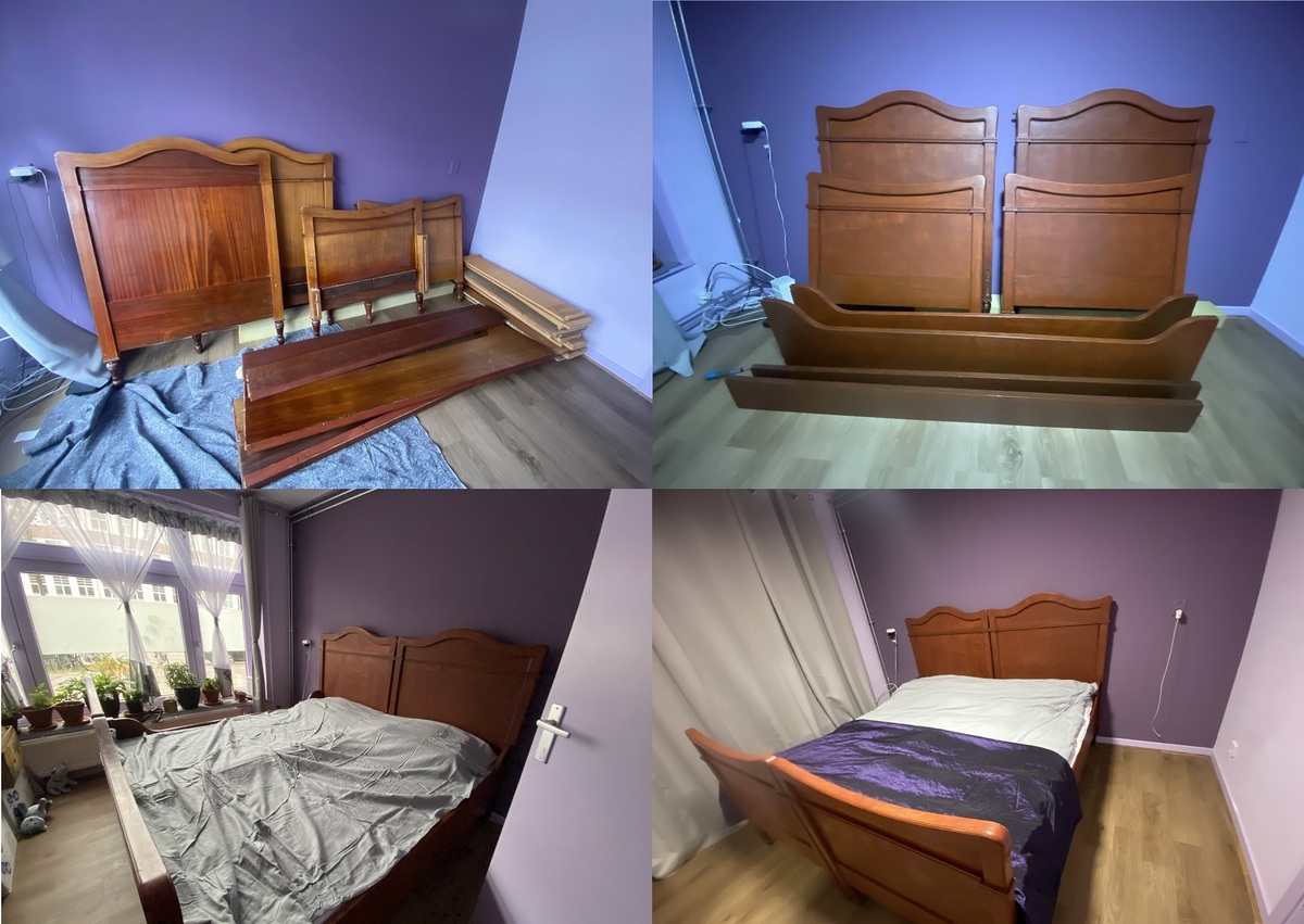 本当は最新の家具を入れる予定で壁の色を決めていたのですが、壁やら床のメンテナンスに思いのほかお金がかかりました。そのためオランダ版メルカリみたいなところで中古の家具を探していたところ、ご近所でアンティークのマホガニーのベッドを出品されていました。出品者の説明では、マホガニーのベッドで彼の祖母が若いころ1920年頃に購入した無垢材。ただし、彼女が新品を購入したのか誰かに譲ってもらったのかは不明。新しいベッドを購入したい願望の為手放すとのこと。少なくとも100年は経過しています。搬入日は2022年10月7日、価格は250ユーロでした。