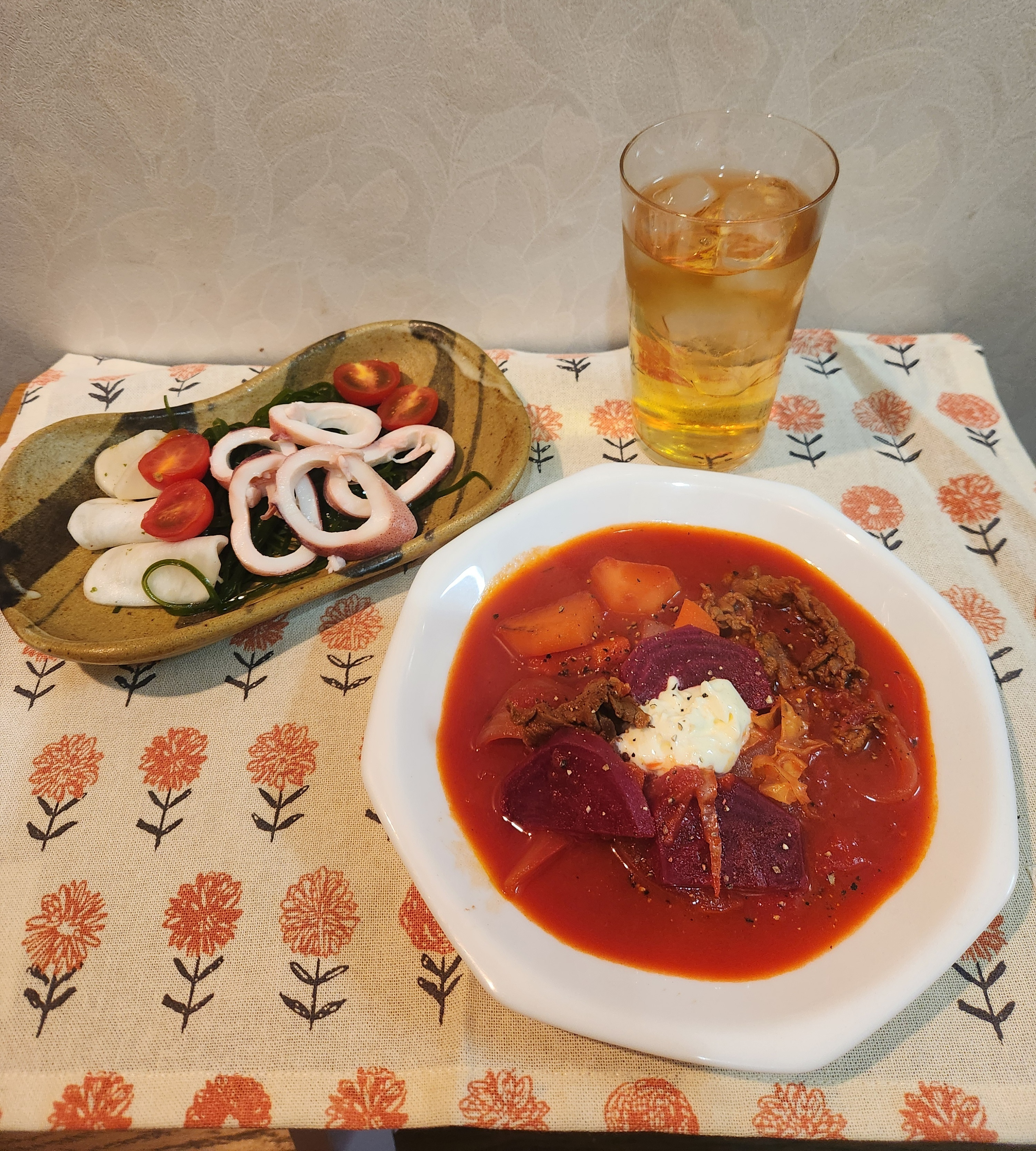 トップ > クッキング > 料理 > ボルシチ カミン 2025/10/21 20:08 ボルシチ お友達にリクエストしてビーツ作って頂きました。初堀頂きましたのでボルシチ作りました✨ 材料 牛肉、ジャガイモ、キャベツ、玉葱、ビーツ、ホールトマト缶、オリーブオイル、バター、赤ワイン、塩、胡椒、砂糖、ニンニク、ローリエ、コンソメ、サワークリーム 手順 材料を一口サイズに切って鍋にバターオリーブオイル、ニンニクを入れて具材を入れて炒め20分ぐらい煮詰める🎶 仕上げ サワークリーム、胡椒て美味しい出来上がり💕 サラダ カブ、切りこぶ、イカのサラダ ボルシチもサラダも美味しいく出来ました☺️ いいね 共有する 共有する X LINE リンクをコピー コメントする 6 件の返信 (新着順) ミュートしたユーザーの投稿です。 投稿を表示 ダンボ 2025/10/23 17:38 とても美味しそうですね! いいね 返信する ミュートしたユーザーの投稿です。 投稿を表示 カミン 2025/10/24 00:07 ダンボ ありがとうございます✨ 今回で作るの2回目ですが美味しいく出来ました😋 いいね 返信する ミュートしたユーザーの投稿です。 投稿を表示 パール 2025/10/22 06:22 早速ボルシチ作ったんですね😊🎶 美味しいですよね😋❤️ イカのサラダも美味しそう😋 お酒が進みますね😉💕 いいね 返信する ミュートしたユーザーの投稿です。 投稿を表示 カミン 2025/10/22 15:56 パール 今回もボルシチ美味しく出来ました😋 イカとカブのサラダもサッパリして美味かったです🥢 お酒🍺🎶🍺🎶🍺は進みます✨ いいね 返信する ミュートしたユーザーの投稿です。 投稿を表示 Grass艹crown 2025/10/22 04:01 ボルシチお家で作ったこと無い〜😂💦 美味しそうだなぁ〜😋🥘✨ビーツの赤で色鮮やか😆👍❤️✨ いいね 返信する ミュートしたユーザーの投稿です。 投稿を表示 カミン 2025/10/22 15:53 Grass艹crown 炒めて煮るだけなので簡単に出来ます(ビーツさえ手に入ればです)✨ 赤い色も食欲が増しますね💕 美味しく出来ました😋 いいね 返信する ミュートしたユーザーの投稿です。 投稿を表示 じゅな 2025/10/21 23:56 美味しそうですね🤤💕 いいね 返信する ミュートしたユーザーの投稿です。 投稿を表示 カミン 2025/10/22 15:48 じゅな ビーツの食感も良く美味しく出来ました💕 いいね 返信する ミュートしたユーザーの投稿です。 投稿を表示 マリーモミ 2025/10/21 22:02 ビーツ色で🤣👍 今日はなんとも冷えて温まりますね(。´艸`。)ㅋㅋㅋ いいね 返信する ミュートしたユーザーの投稿です。 投稿を表示 カミン 2025/10/22 15:47 マリーモミ これからの季節にピッタリです💕 採れたてビーツ美味しいかったです😋 いいね 返信する ミュートしたユーザーの投稿です。 投稿を表示 ice mint 2025/10/21 20:20 美味しそうなのが伝わってきます☺️ お店の料理みたいで素敵です💓 いいね 返信する ミュートしたユーザーの投稿です。 投稿を表示 カミン 2025/10/22 15:46 ice mint 褒めて頂きありがとうございます✨ 美味しく出来ました💕 いいね 返信する