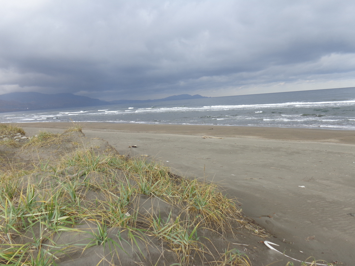 ここは、札幌から一番近い、石狩湾です。夏場はドリームビーチとして賑わっていますが、「今はもう秋、誰もいない海」になっています。向こう側に見えるのは小樽の山と平野部です。小樽は山坂が多い街です。食べ物はうまいですよー(^^)