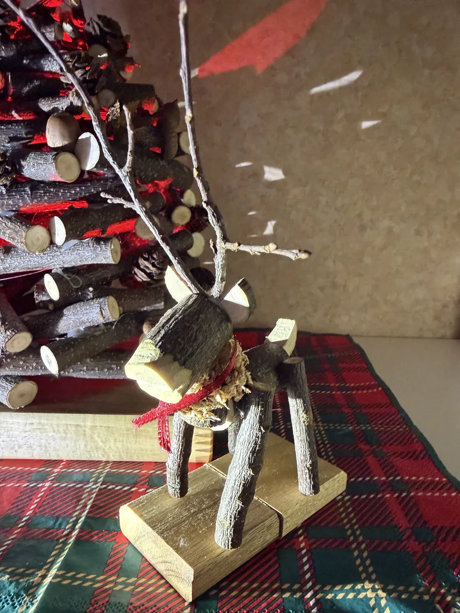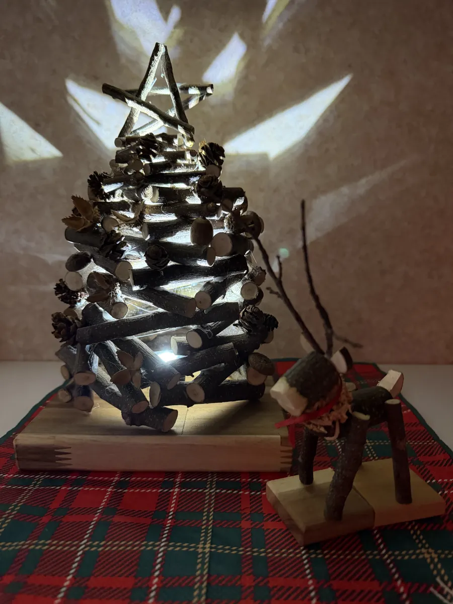 投稿を表示小枝のクリスマスツリー🎄ライトアップされてとっても素敵🥰トナカイちゃんも可愛い😍
