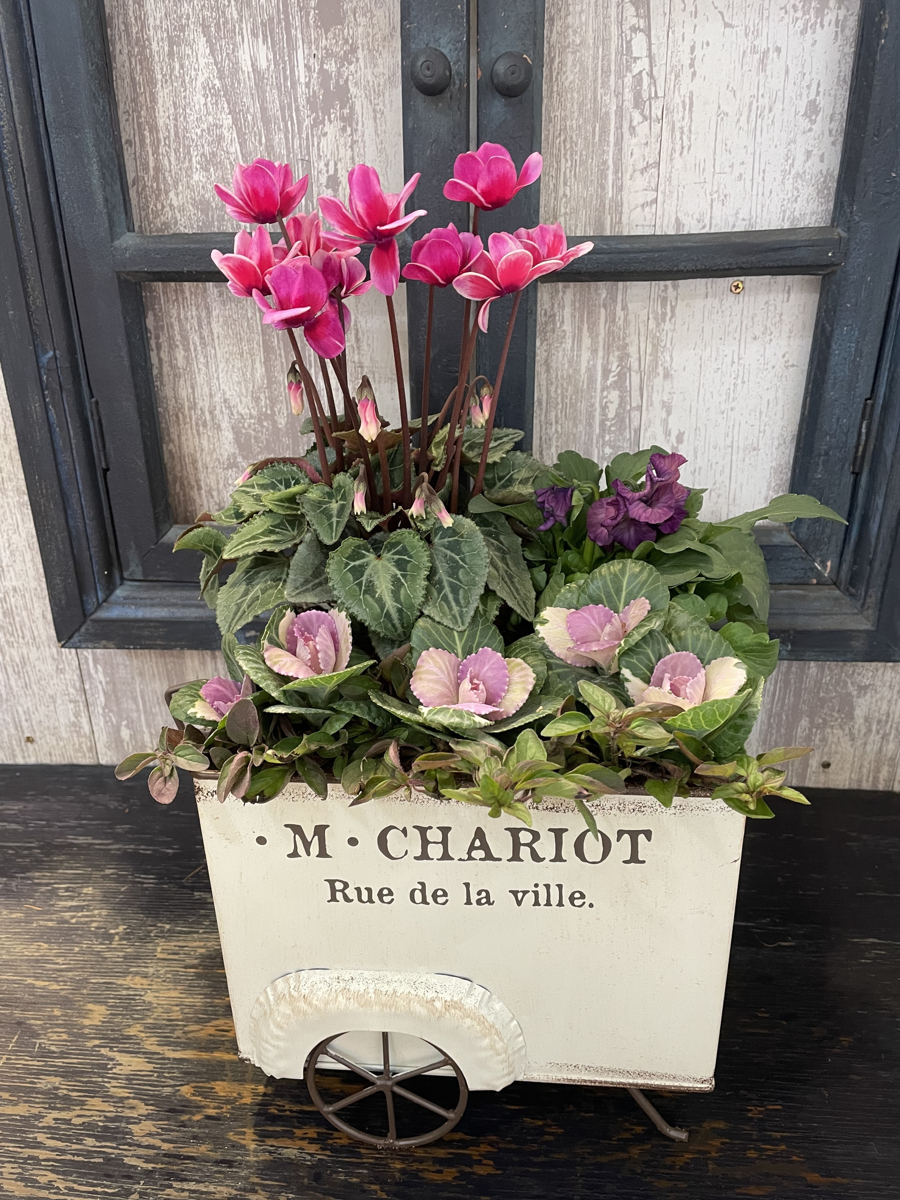 投稿を表示ブリキの白い鉢に車輪も付いて、ピンク色のお花も映えて、とても可愛いですね❣️