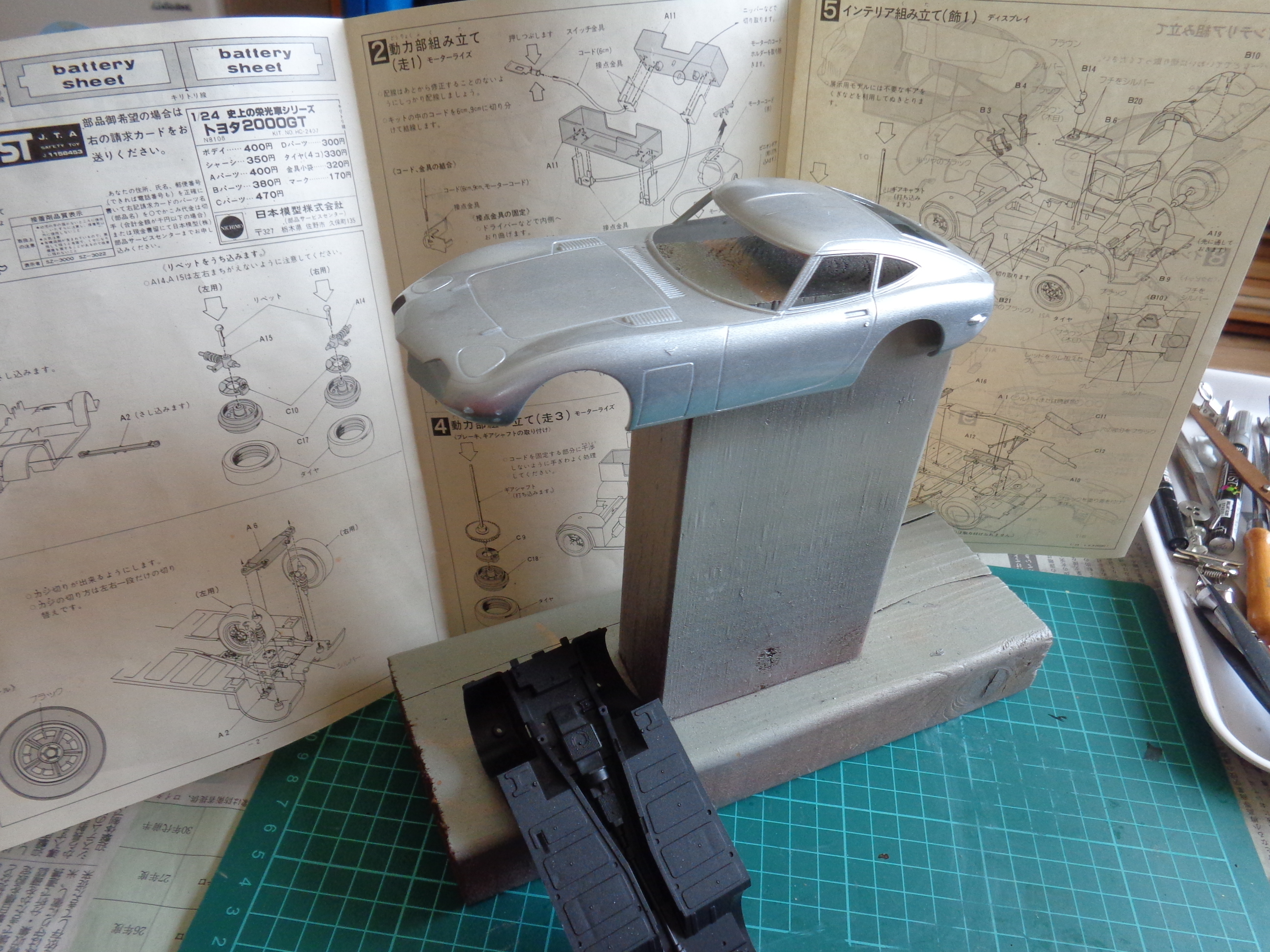 こんにちは、totoroです。2000GTの塗装が終りました。色は大人ぶってシャイニングシルバーを選びましたが、この色は曲者でした。メタリックの粒子が荒いみたいで、粒子の濃いところがムラになるんです。一回目の塗装で失敗したところは思い切ってキッチンペーパーで上面だけをふき取り、2時間ほど乾燥させてから二回目の塗装に入りました。ムラは見た目は気にならない程度まで消えましたが、やっぱり気持ちシックリしません。それでもう一度乾燥させてからつや出しトップコートを吹きかけて・・・。ああ、これなら大丈夫です。良かったぁ~!それでは古茶けた説明書を見ながらシャーシから組み立てに入りまーす。(^^)