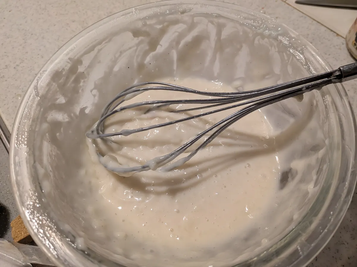耐熱ボウルに小麦粉と牛乳を入れ、泡立て器で十分に混ぜてラップする。