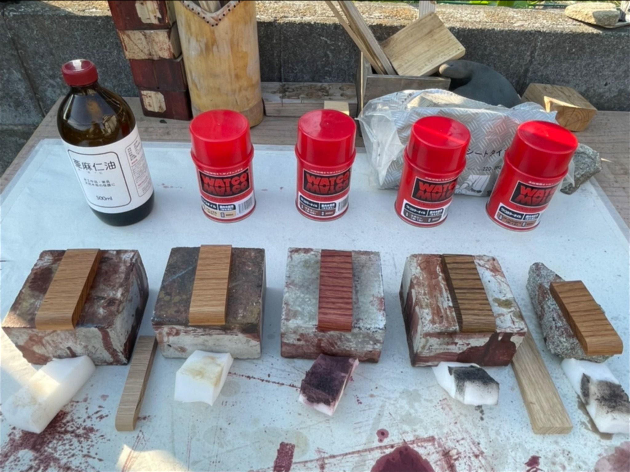左から、亜麻仁油、ワトコオイルのナチュラル、マホガニー、エボニー、ミディアムウォルナットの5色。間に置いてある木片が無塗装の材です。
