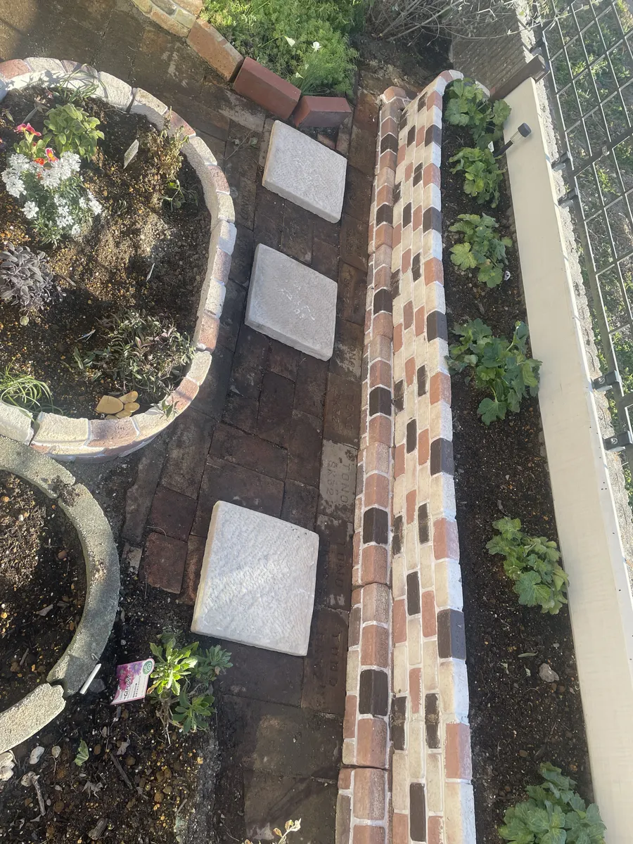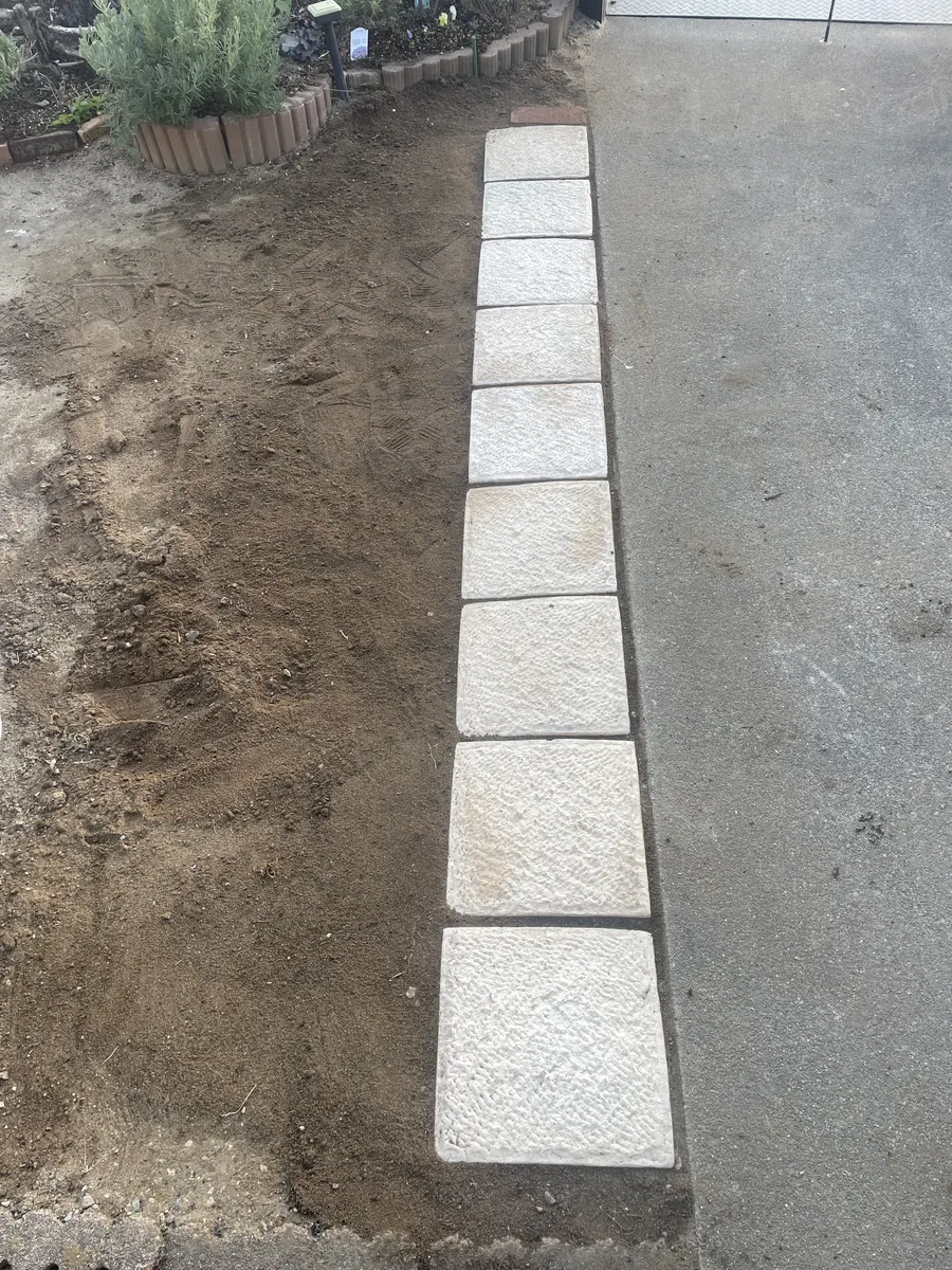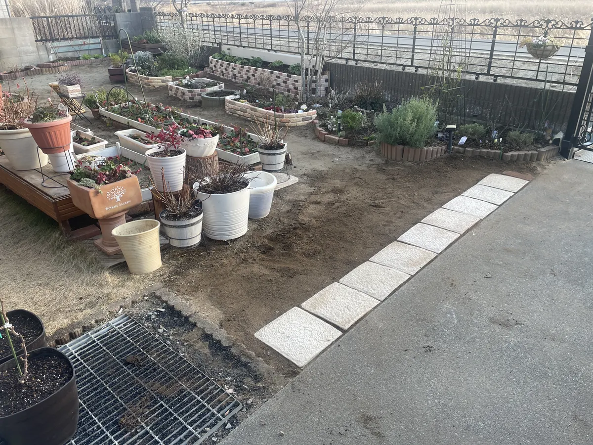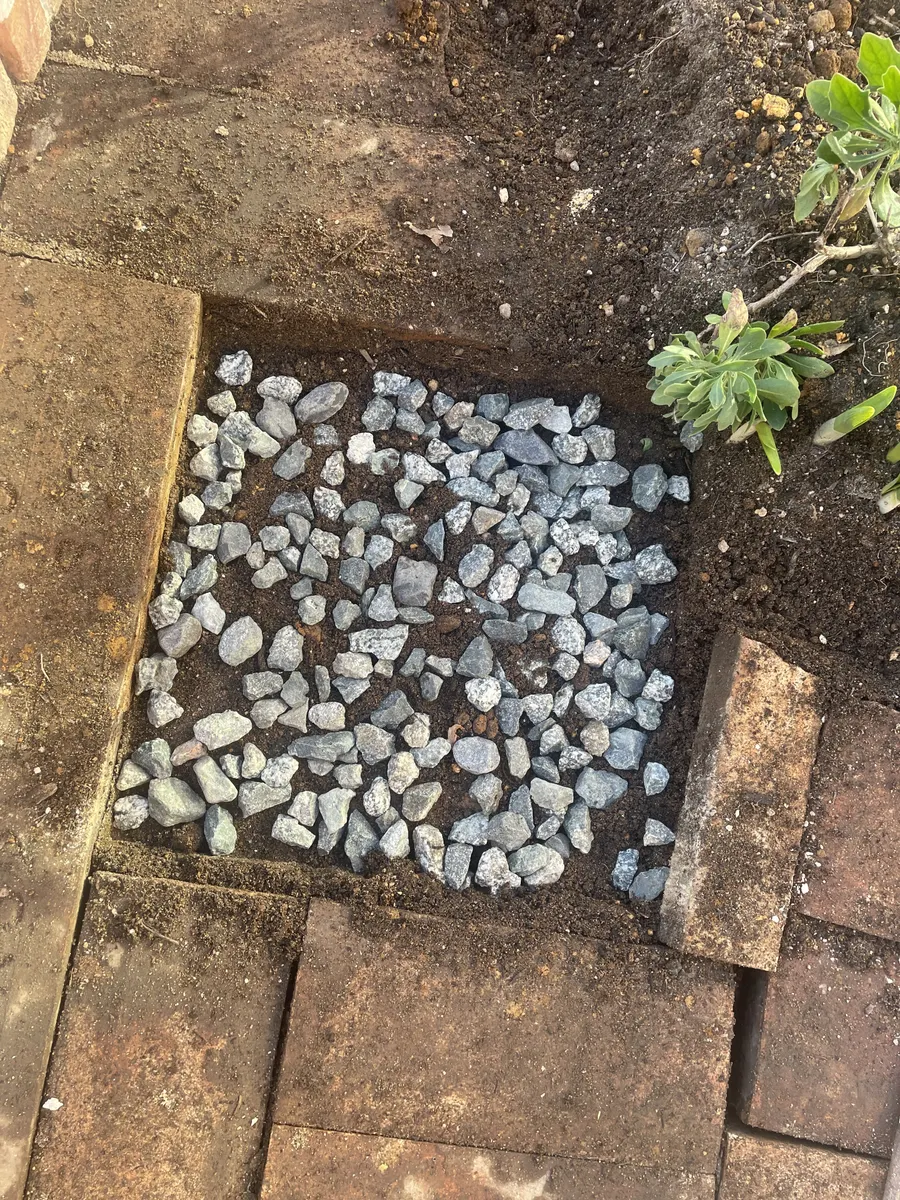 レンガを外して砕石を引いて一枚貼りましたがイマイチだったので私のイメージしていた別の場所に貼る事にしました。