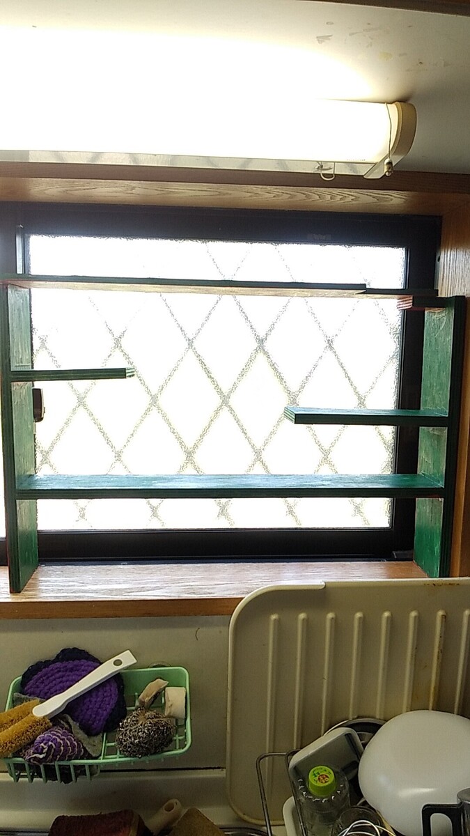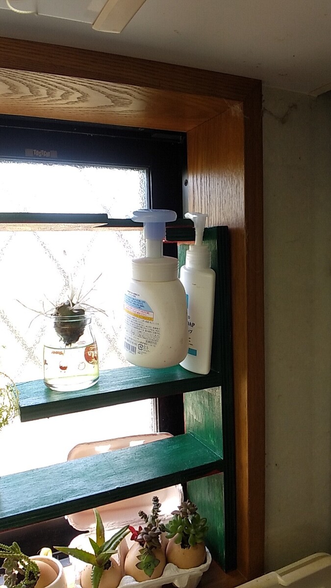 端材も寸法足りないところは端材を組み付けて、なんとか形に、欠けたところは丁度よい感じに、ハンドソープが架けられて、弱り目に当たり目!(祟り目じゃなくてよかった)