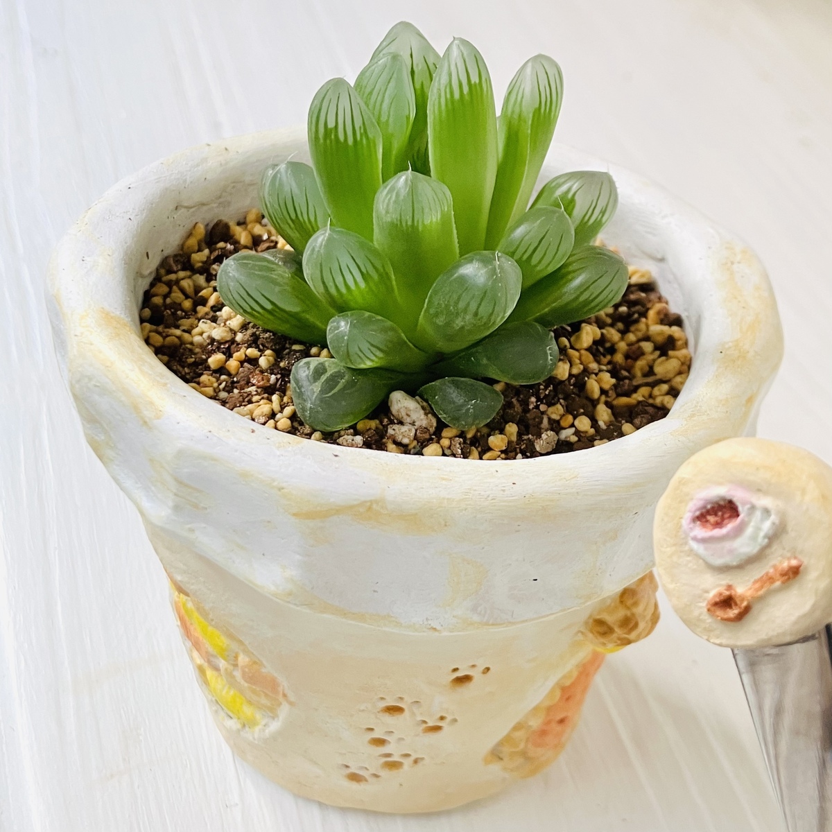 その鉢に、Tagさんから頂いたハオルチアを入れました。光に当たると半透明な果肉がキラキラ✨白い斑が綺麗に見えます🤩宝石のような透明感にうっとりしています🪴