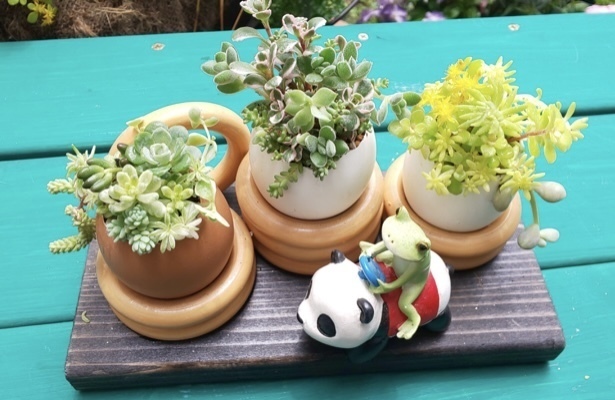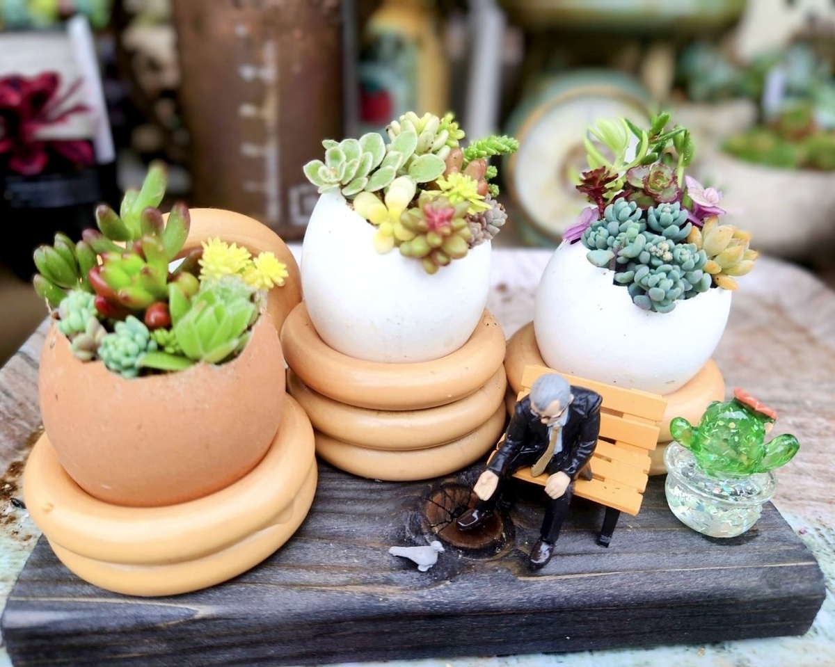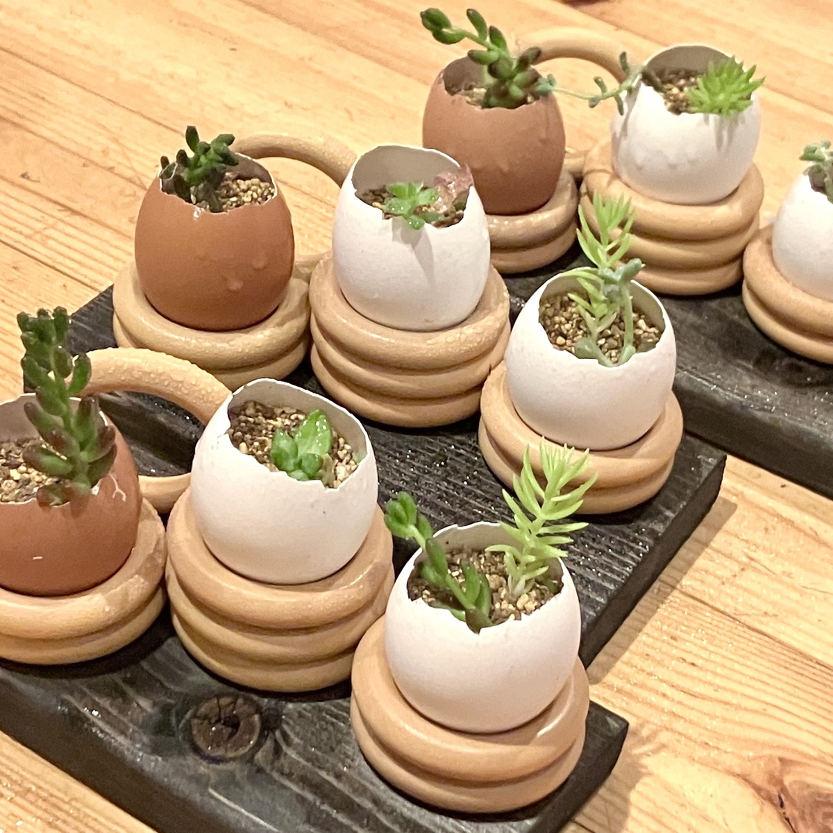 この日、私は卵の殻の器に、自宅で葉挿しして根が出た小さい芽🌱を2本ずつ入れた、多肉を持って行きました。
