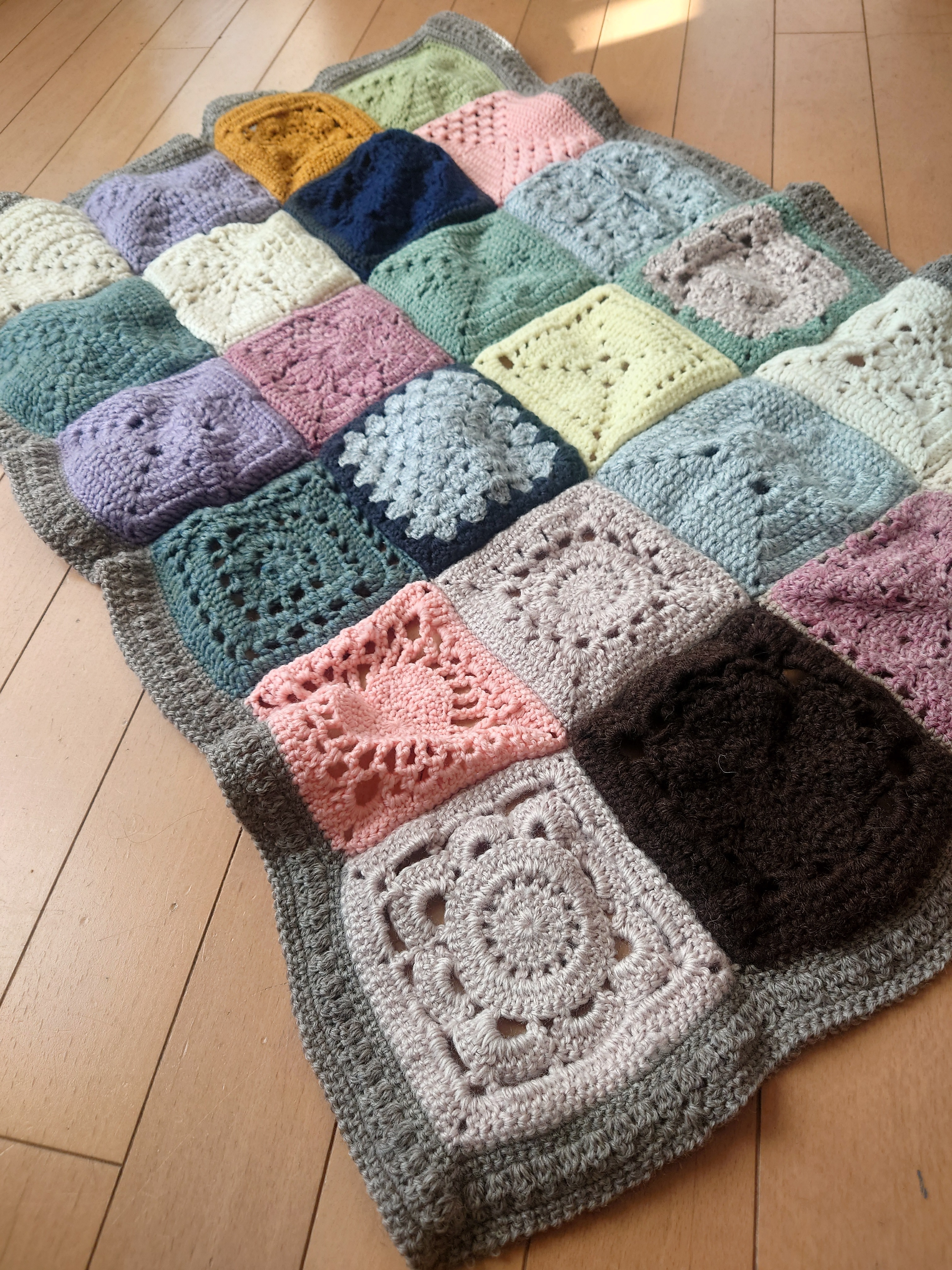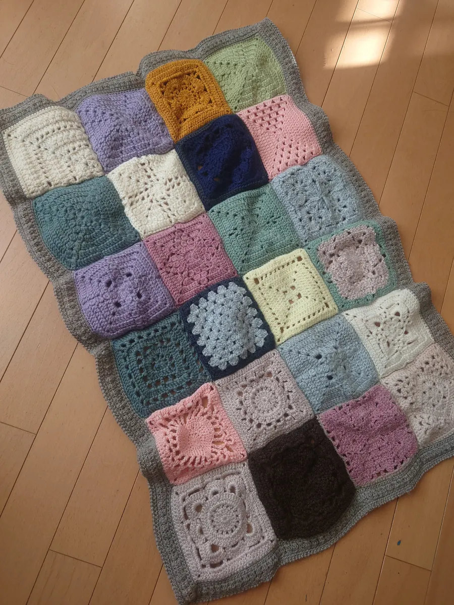 落ち着いた色合いで素敵なひざ掛け、あったかそうです🥰