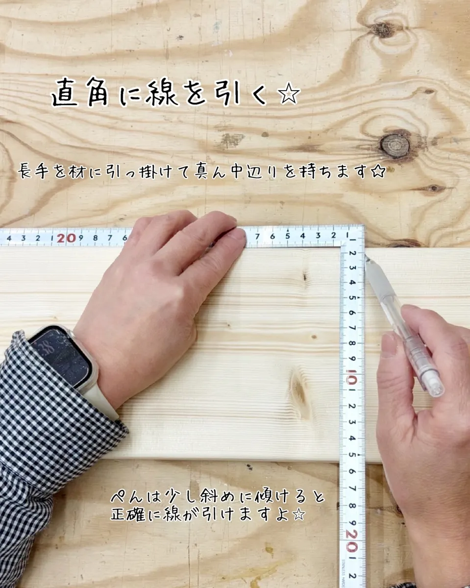 材の角に長手をしっかり引っかけて固定します。持つ位置はさしがねの真ん中辺りです。