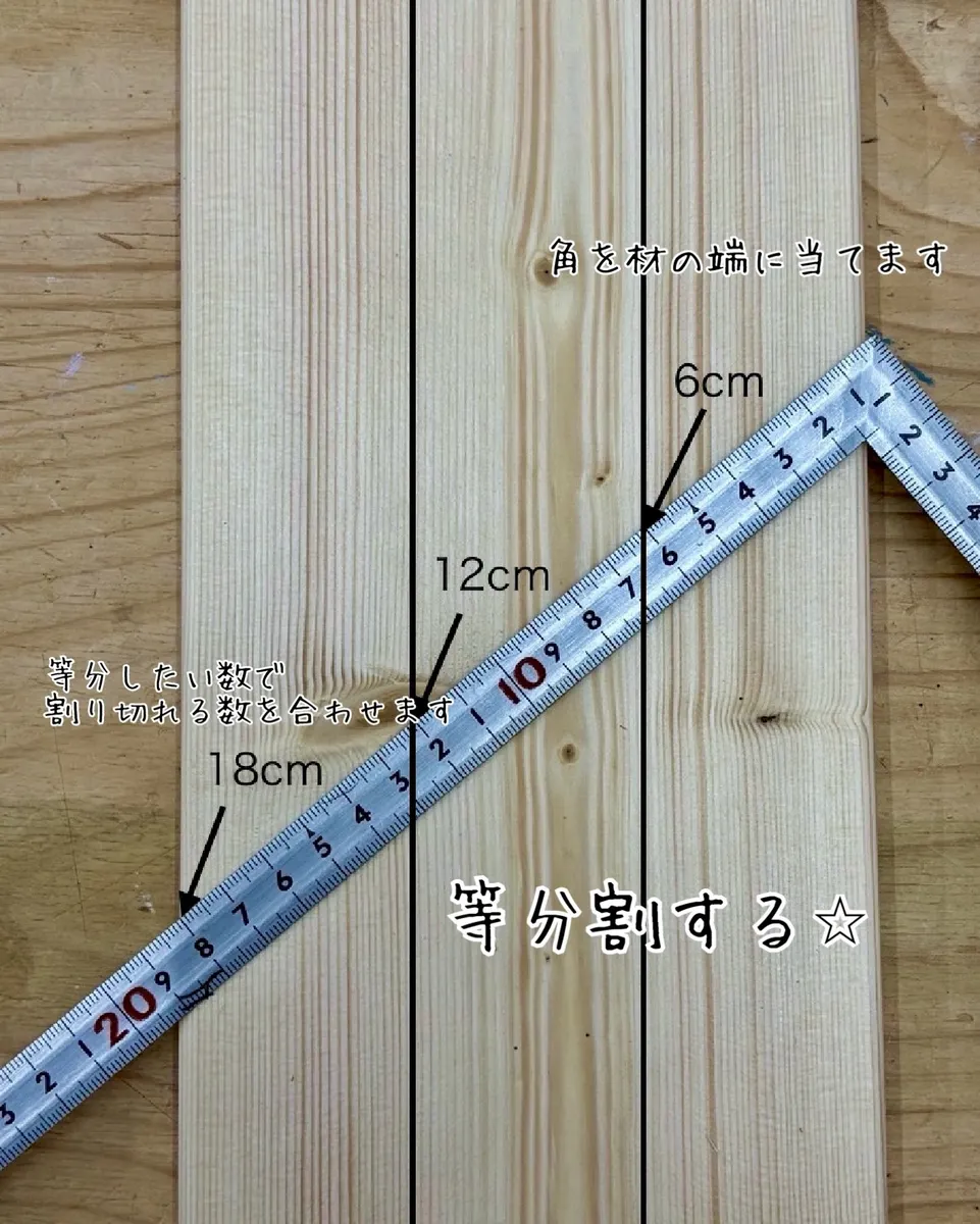 さしがねは、等分割したい時にもとても便利です。端から同じ長さで印をつけていくだけで、ビス位置やダボ穴、棚板の配置などをきれいに等分割出来ます✨