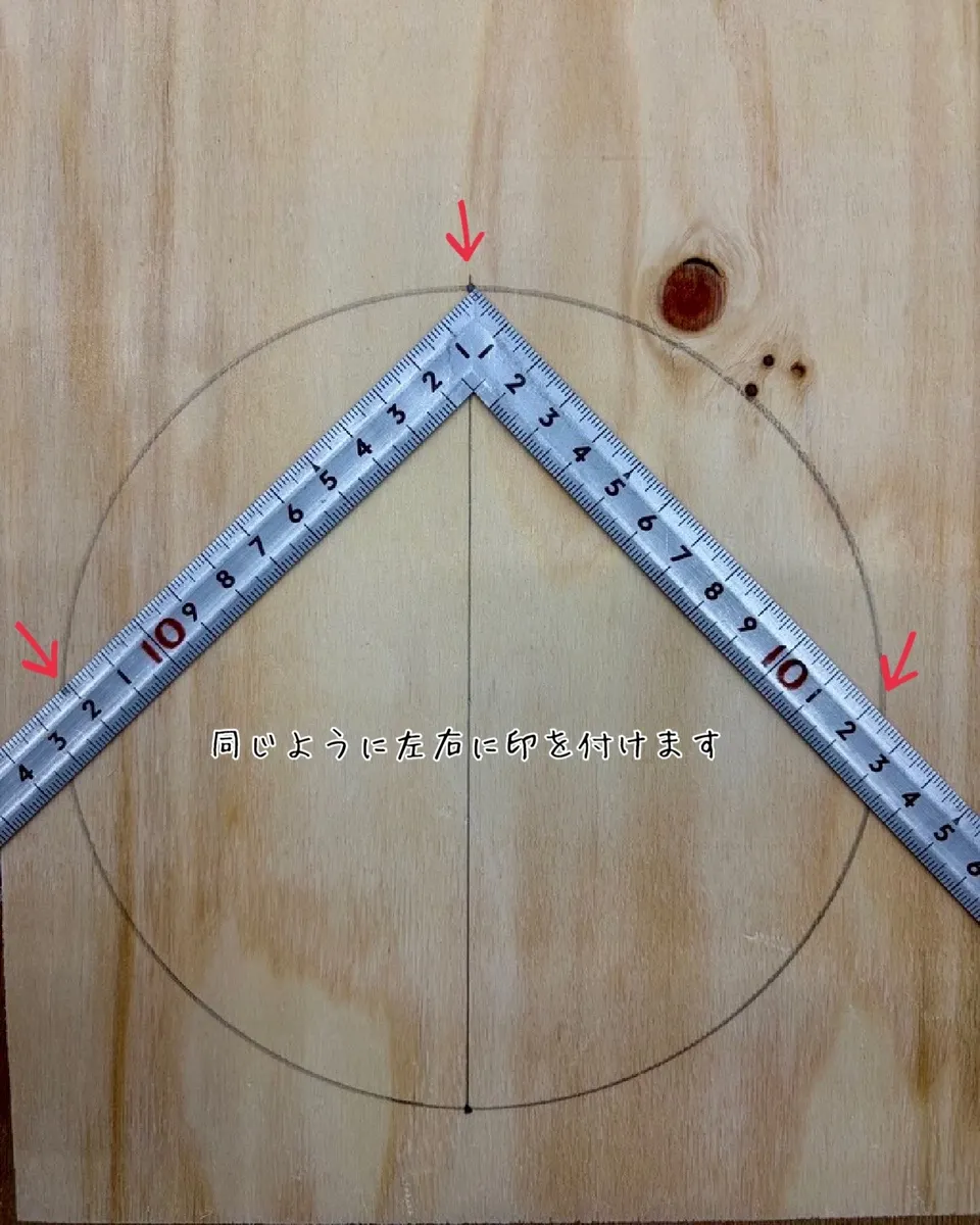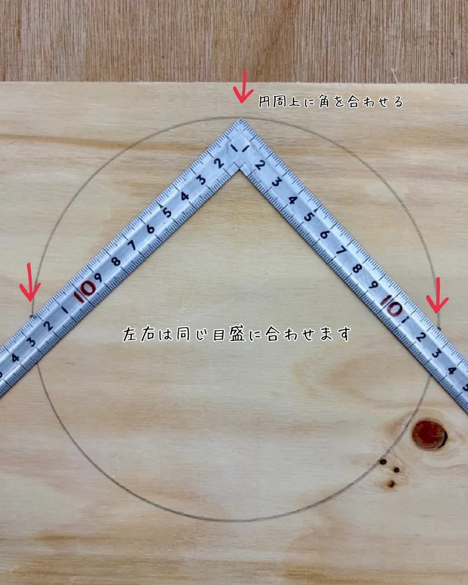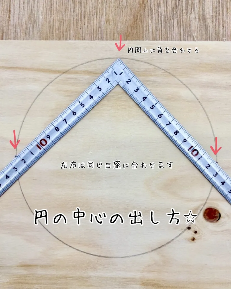 円周上にさしがねを数箇所あてて線を引き、その交点が円の中心になります。