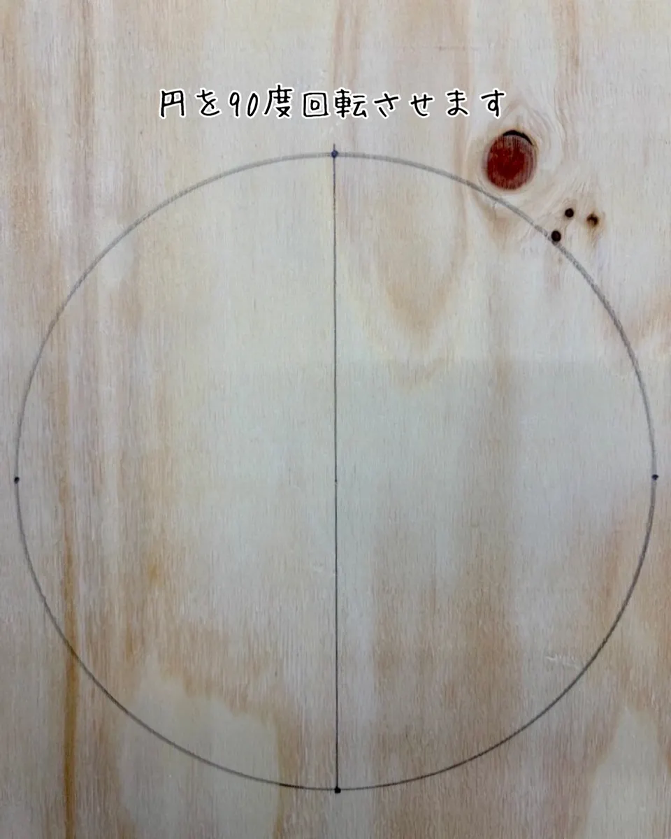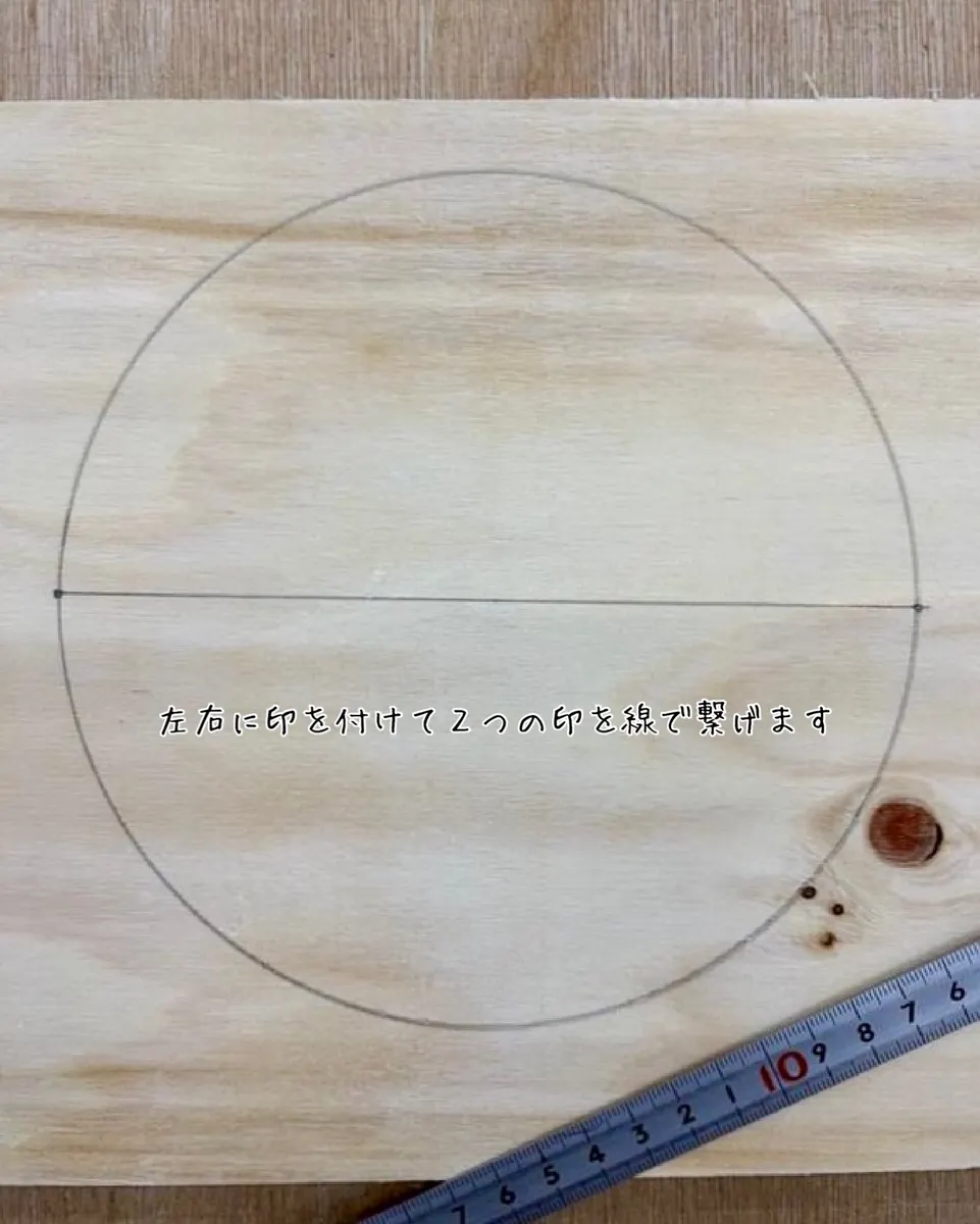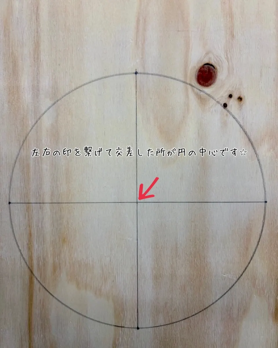 円周上にさしがねを数箇所あてて線を引き、その交点が円の中心になります。