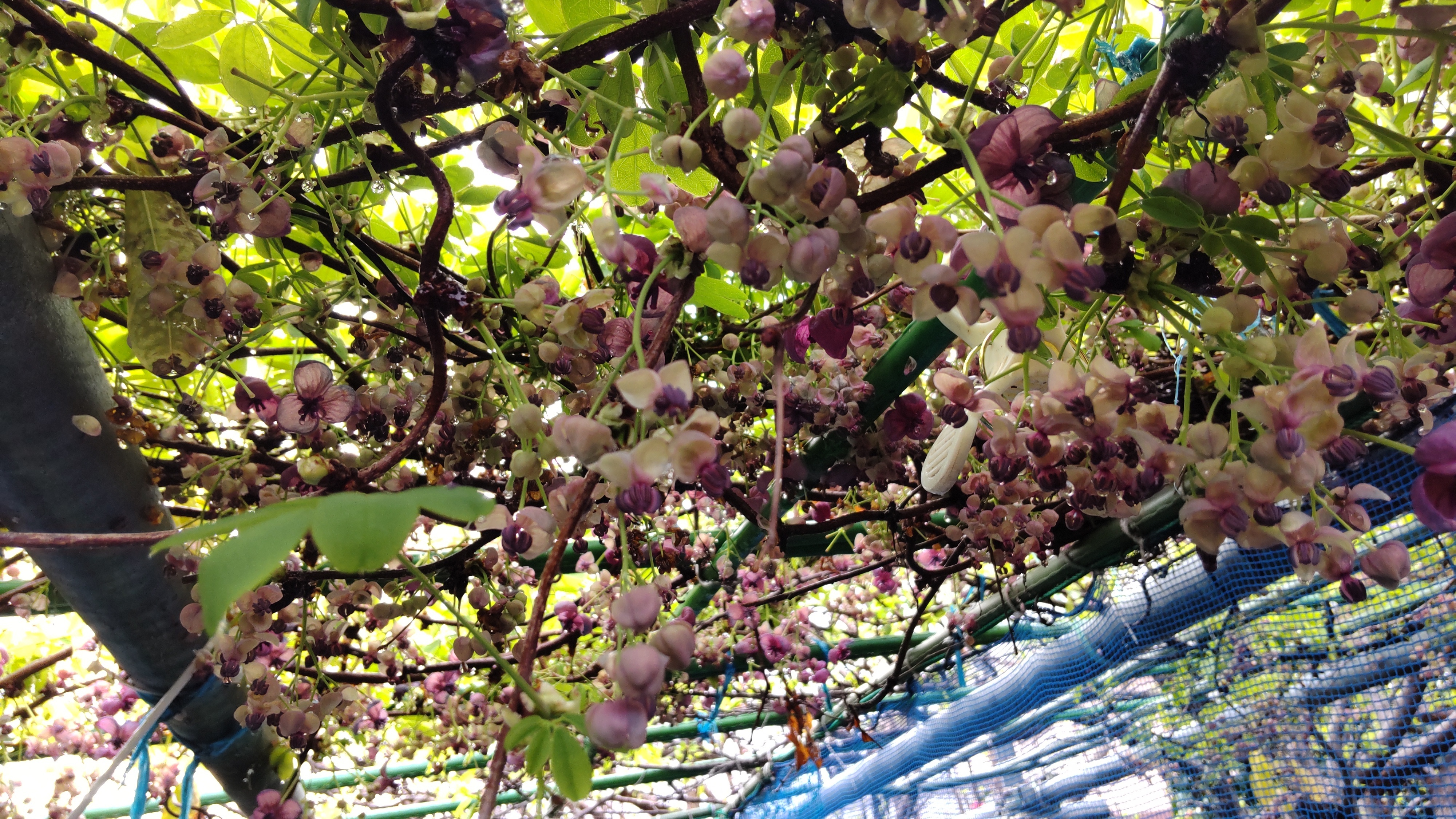 アケビの花初めてみました。お手入れが良いからたくさんの花が咲くんでしょうね。すごいです✨