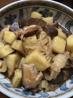 母が美味しいどんこの椎茸を食べたいというので、キタアカリとしらたきと一緒に煮物を作ってみました