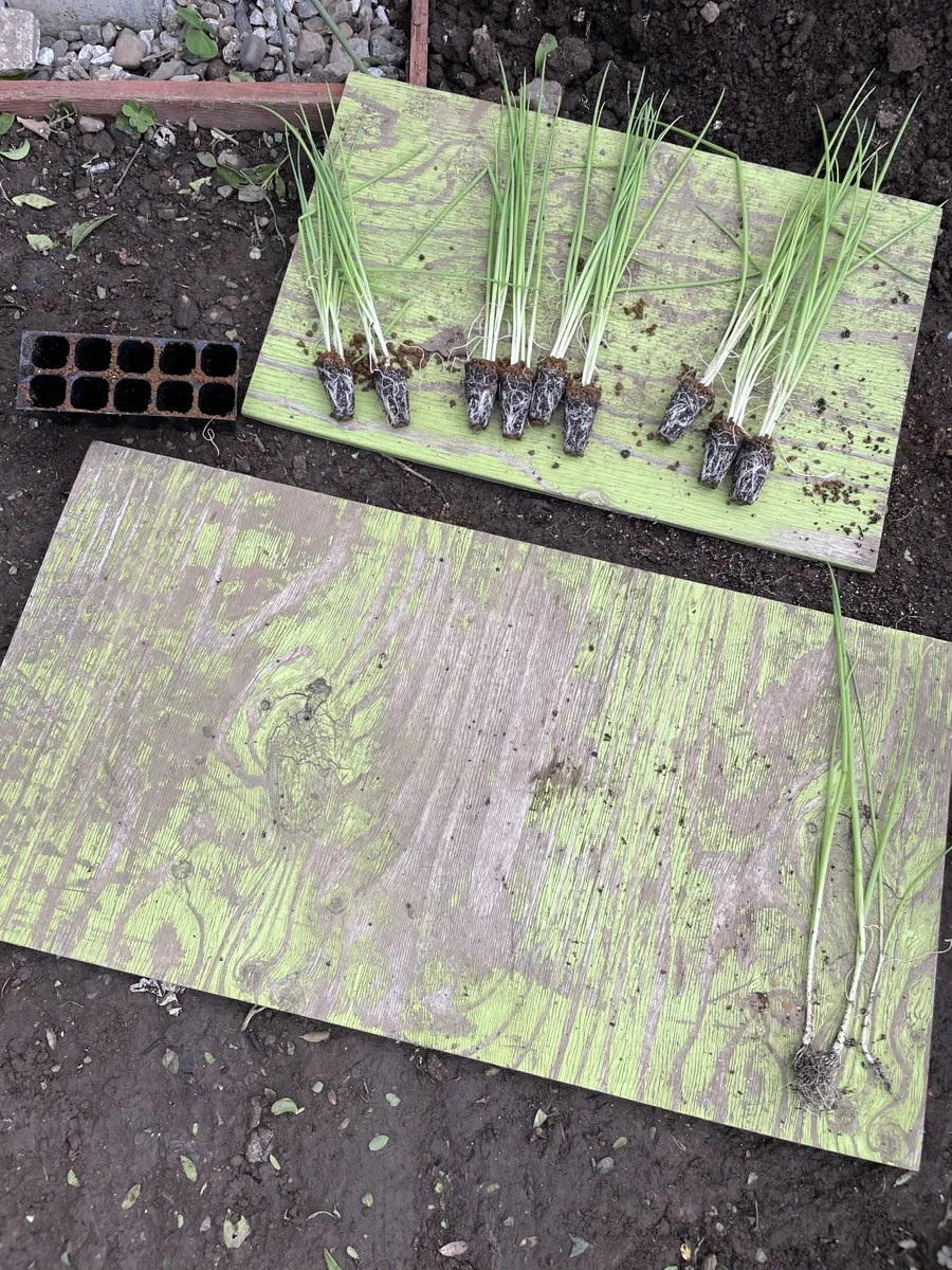 トレイ1個分をバラさず、10個で仮植え、←トレイの中で根が圧縮されてます。