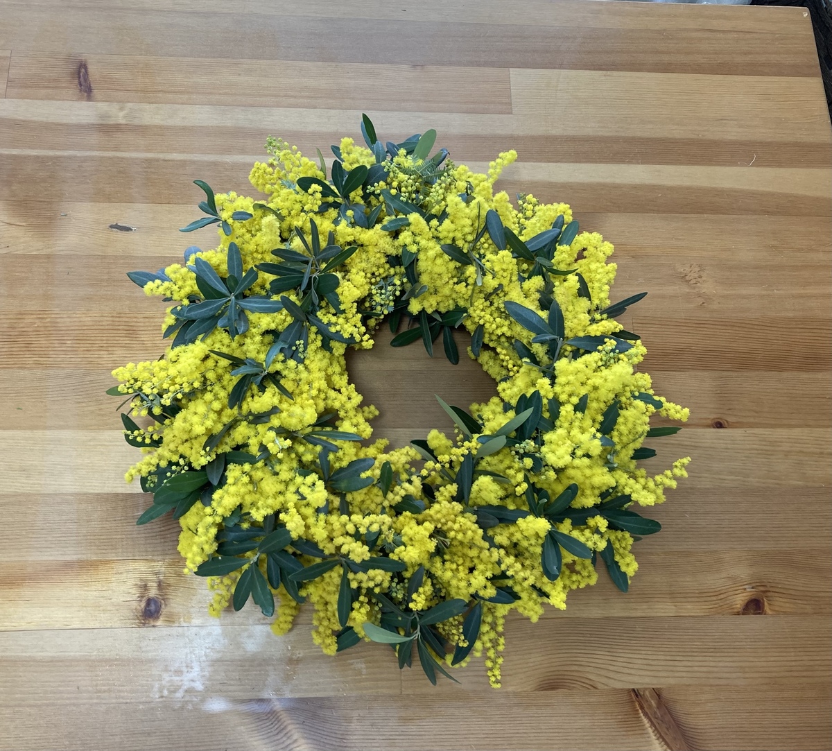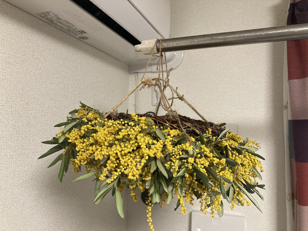 フレッシュミモザを使って作ったのでそのまま壁に掛けるとミモザが垂れてしまうので少しドライになって形が付くまで逆さまに吊るしてました♩¨̮