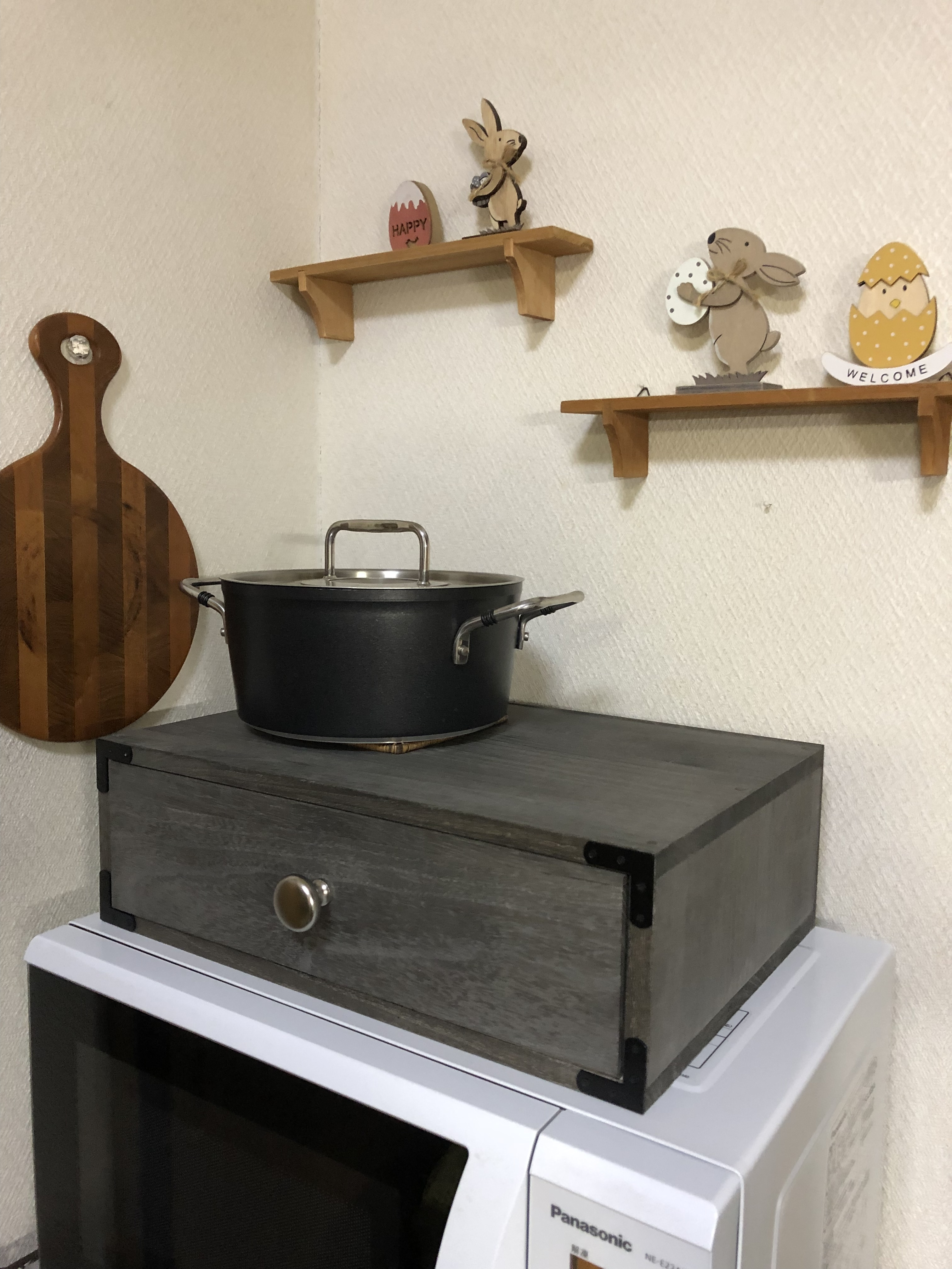 トップ > DIY > インテリア > 一段引出し 吉光 2022/01/30 09:44 一段引出し 先日作った一段引出し。 置く場所が決まらず🤔一先ず電子レンジの上に居てもらってます💧レンジの上に乗ってた鍋がそのまま引出しの上に乗り、引出しに入れる物もキッチンではないので😔もっと活躍する場所を探さないと👌 いいね 共有する 共有する X LINE リンクをコピー コメントする 4 件の返信 (新着順) ミュートしたユーザーの投稿です。 投稿を表示 ちきりん 2022/01/31 09:39 お鍋と色があってこれはこれでありと思いましたが😆😆納得できる場所が見つかるといいですね!以前私の投稿についての質問にコメントしていただきありがとうございました!お礼の返信ができなくて…スッキリ解決しました😆 いいね 返信する ミュートしたユーザーの投稿です。 投稿を表示 吉光 2022/02/02 00:49 ちきりんさん コメントにお礼だなんてお気遣いありがとうございます😘 息子が使ってくれそうな感じです(多分)。 男前な仕上がりにしたのが良かったかも👍 いいね 返信する ミュートしたユーザーの投稿です。 投稿を表示 ゆうちゃん 2022/01/31 00:34 移動先決まりましたか? 使い勝手が良い引出しなので、どこに移動しても大丈夫👌 いいね 返信する ミュートしたユーザーの投稿です。 投稿を表示 吉光 2022/02/02 00:56 私もそう思います。 使い勝手が良さそう!と思って迷わずWSに参加しました😃 あっちへ置いてもこっちに置いても活躍してくれると思いますのでずーっと大切に使い続けたいと思います💕 いいね 返信する ミュートしたユーザーの投稿です。 投稿を表示 はならん 2022/01/30 11:33 洋室でも和室でも良い素敵なカラーですね。🤗 レンジの上だと、放熱が出来ずにレンジが壊れたり、火事も心配なので早く新しい置き場見つけてあげてね〜😅 いいね 返信する ミュートしたユーザーの投稿です。 投稿を表示 吉光 2022/01/30 16:09 はならんさん 確かに! ココは放熱の妨げになりますね😓 さっそく移動! 移動‼︎ ありがとうございます いいね 返信する ミュートしたユーザーの投稿です。 投稿を表示 きょろっち 2022/01/30 09:59 男前金具がかっこいいです☺ 電子レンジの上に置くと意外と大きさを感じますね。 いいね 返信する ミュートしたユーザーの投稿です。 投稿を表示 吉光 2022/01/30 16:13 そうなんです。 男前な出来になったので、息子に使って貰う方向性で思案中😊 いいね 返信する