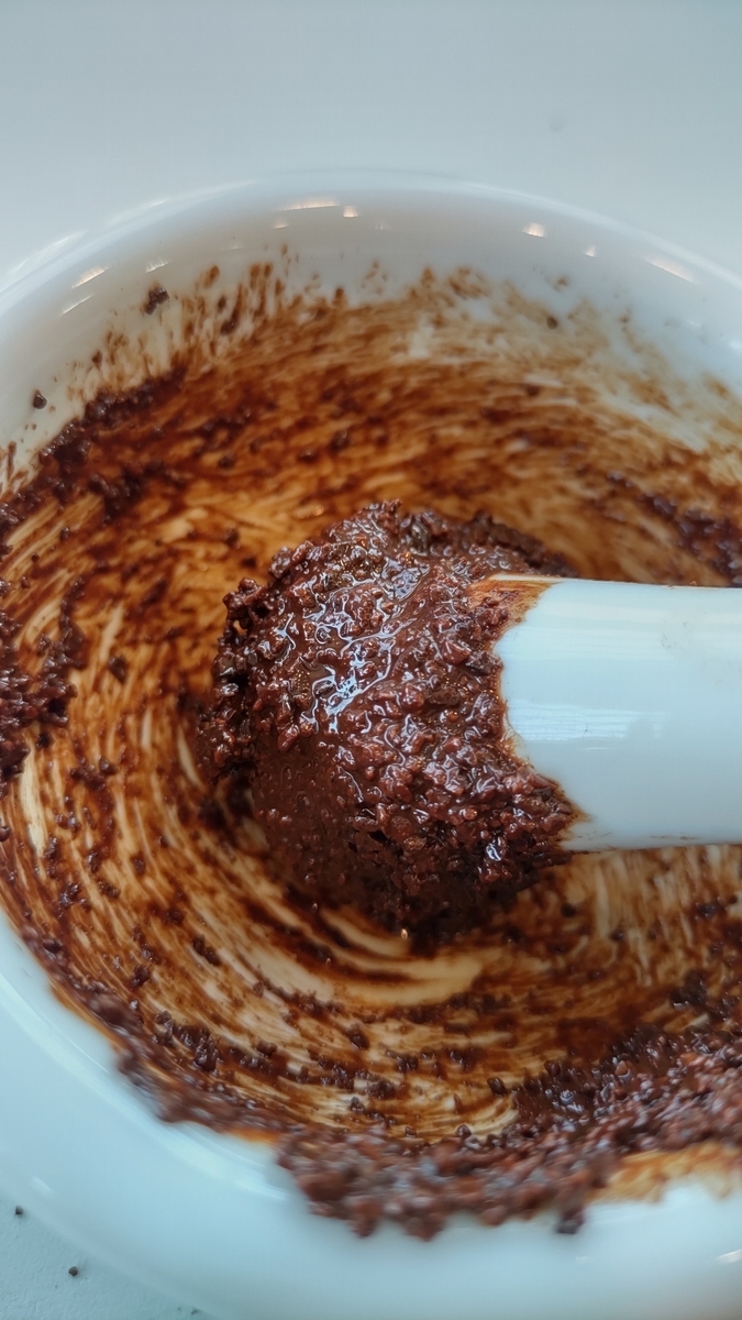 30分ほどすりつぶし続け、少しネットリしたら、湯煎にかけて、またすりつぶし続けます。かなりの重労働😅😂😭