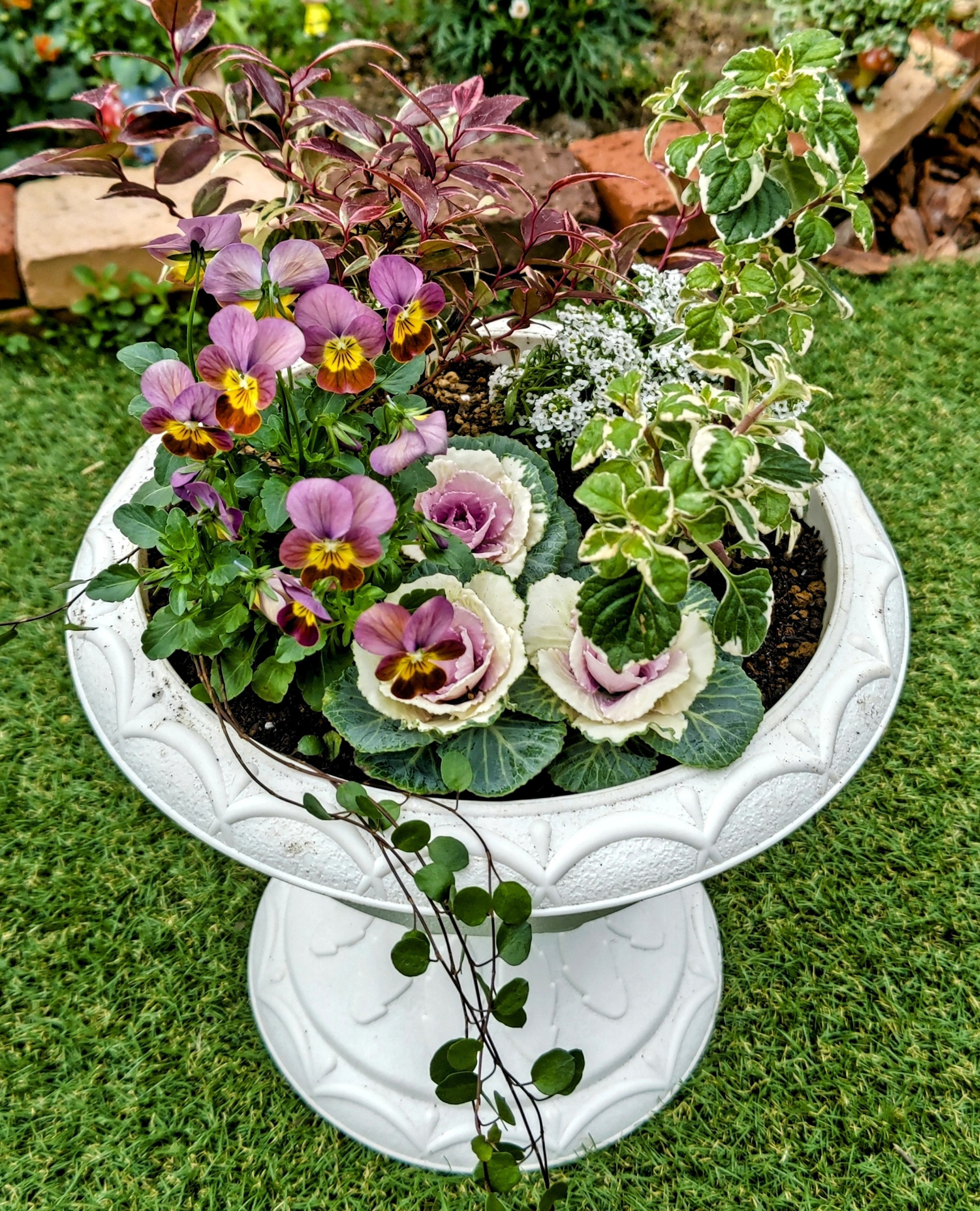 葉牡丹の中心の色合いからビオラ(間違っていたらごめんなさい)へとのグラデーションが美しい寄せ植えですね♡ヽ(´ω`)ノ