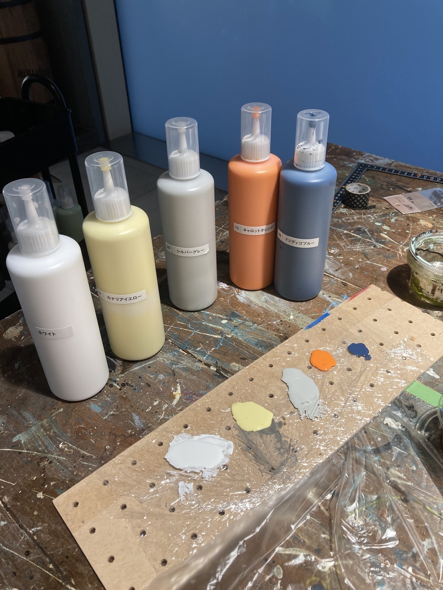カラーは、パーフェクトホワイト カナリアイエロー シルバーグレー キャロットオレンジ インディコブルーで、幾重にも色合いを見ながら調整塗装しました 何度やっても、ここが一番楽しい♬💕ウキウキ カラーの反応が、ここでいかようにもアレンジできるのですぅ♬♬💕用意された手づくりのオシャレパレットにいろんな色の塗料が並ぶのも、見ているだけでウキウキ♬💕(笑)