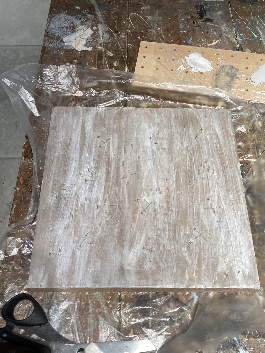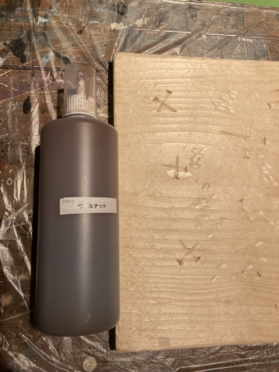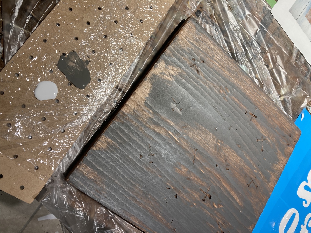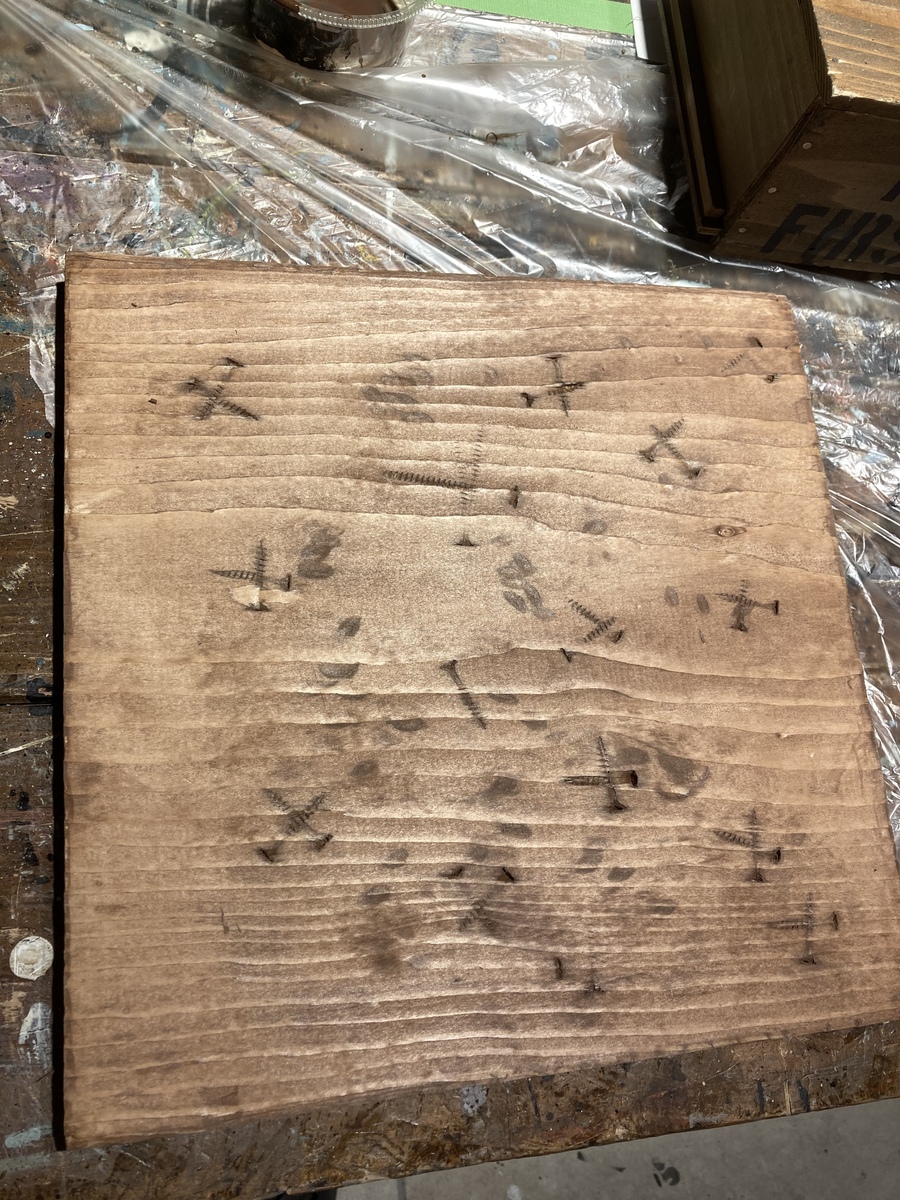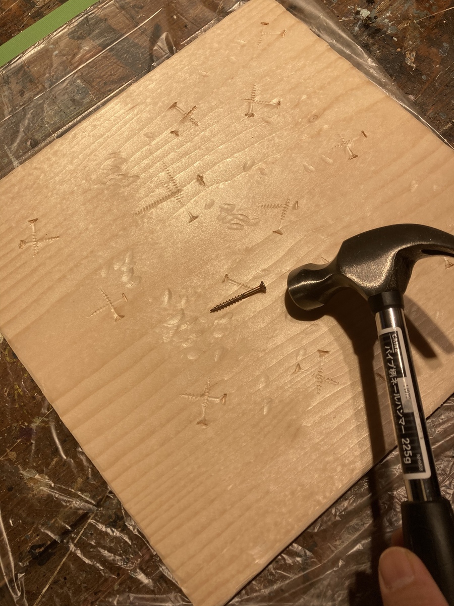 ↓スクエア状のパインboardに、いつものように、ハンマーとビス等で、ガンガン、ダメージ加工を施し。。。