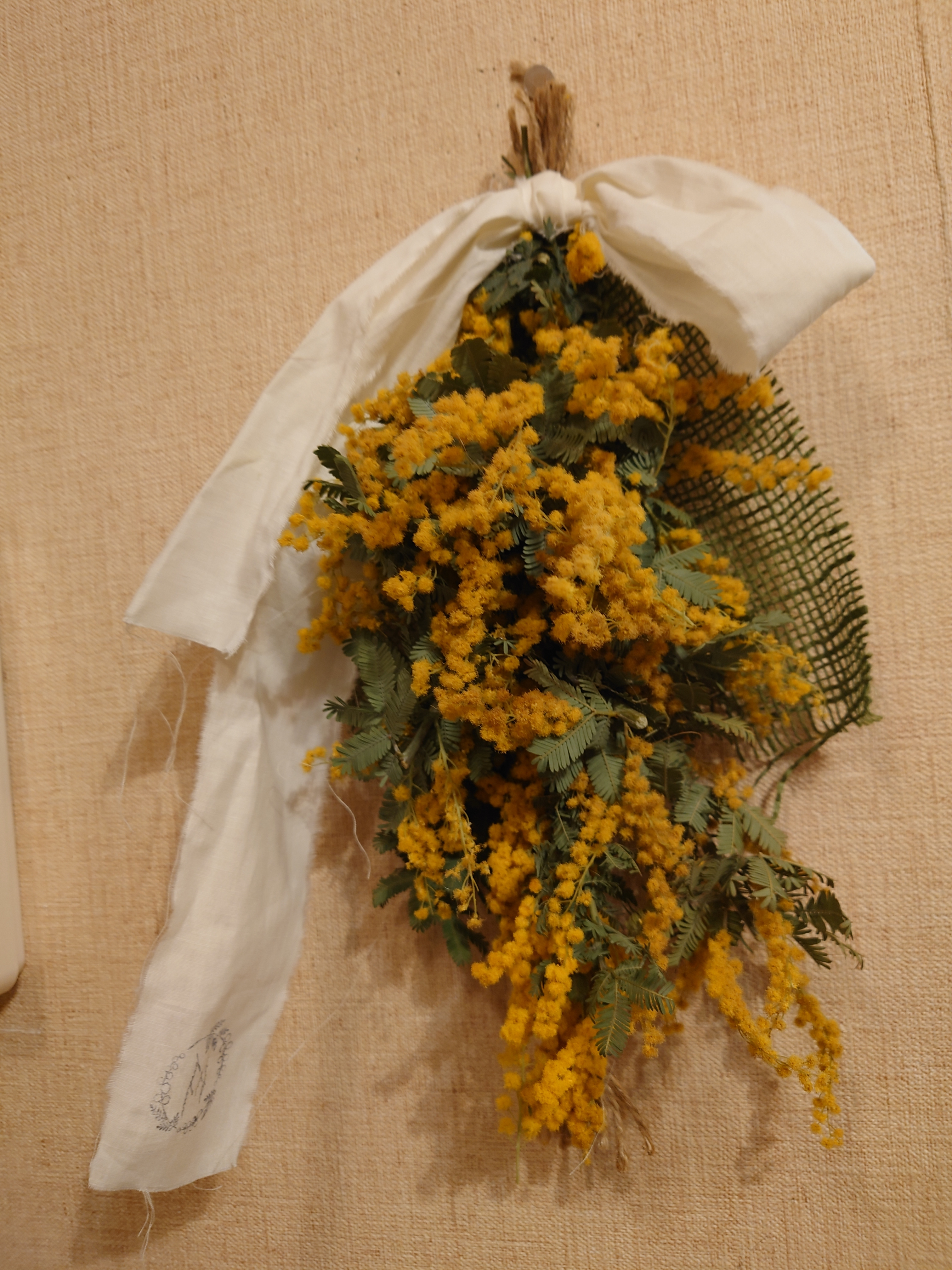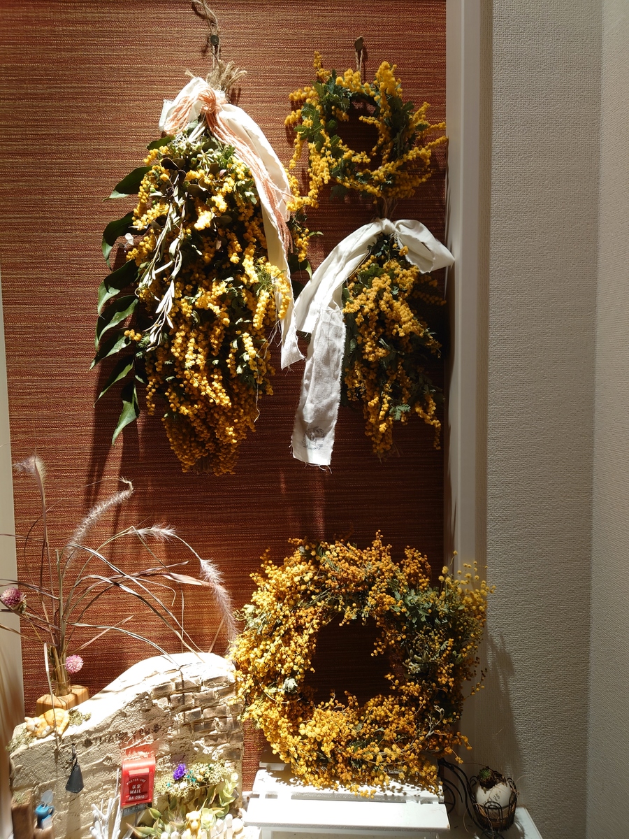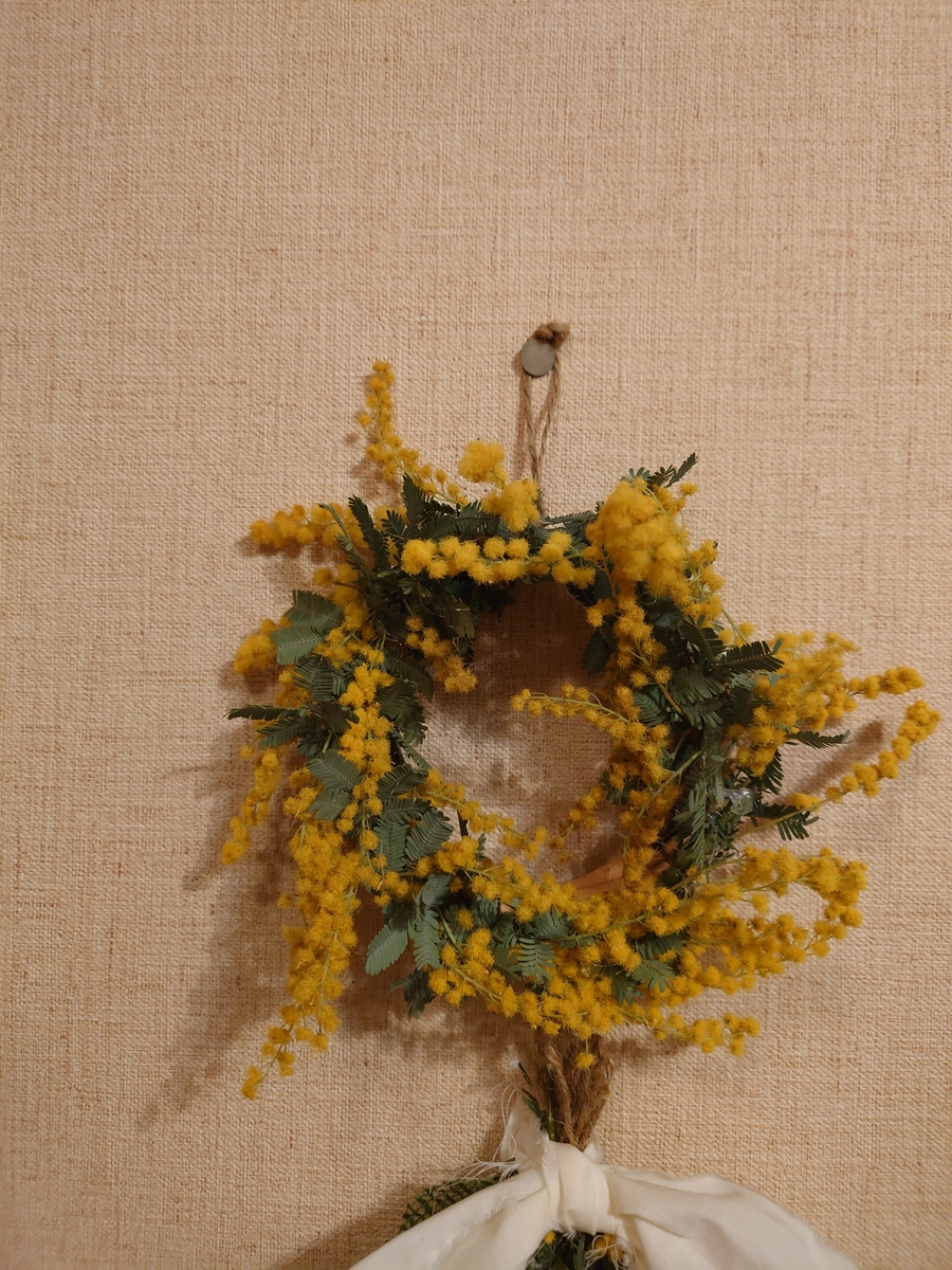 ミモザをスワッグやリースにする時、どうしても小さなお花は取り除いたりしますね。捨てるのは勿体無くて、私も小さな鉢に入れて飾ってます❣️